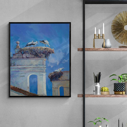 Ein authentisches, außergewöhnliches Ölgemälde einer imposanten Kathedrale, in deren Turm Störche nisten, oder aus der Nähe, mit den Vögeln, die auf einem Dach sitzen. Als nächstes wird eine Skizze angefertigt,...