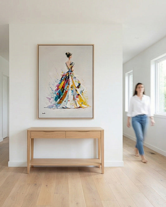 Ölgemälde: Elegante Frau in mehrfarbigem abstraktem Kleid, 120 x 90 cm