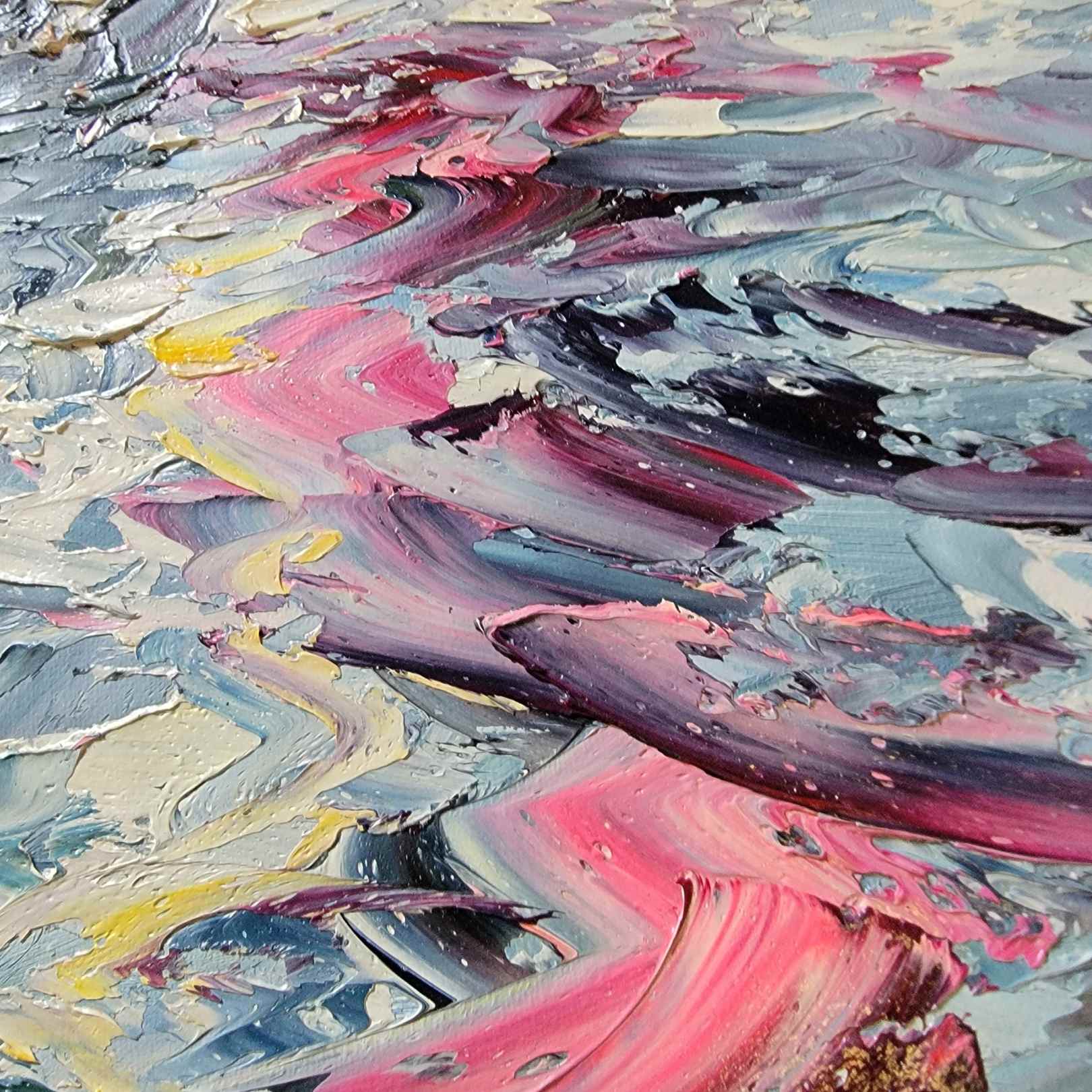 - Spürbare und sichtbare Textur durch die aufgetragenen Farbschichten.