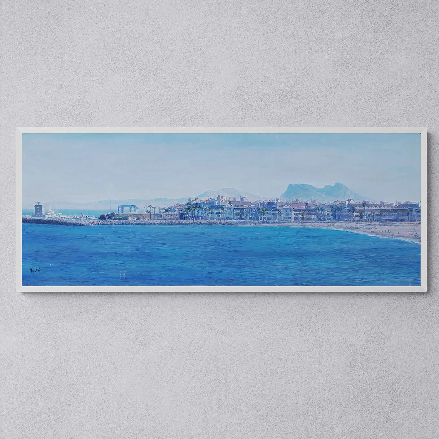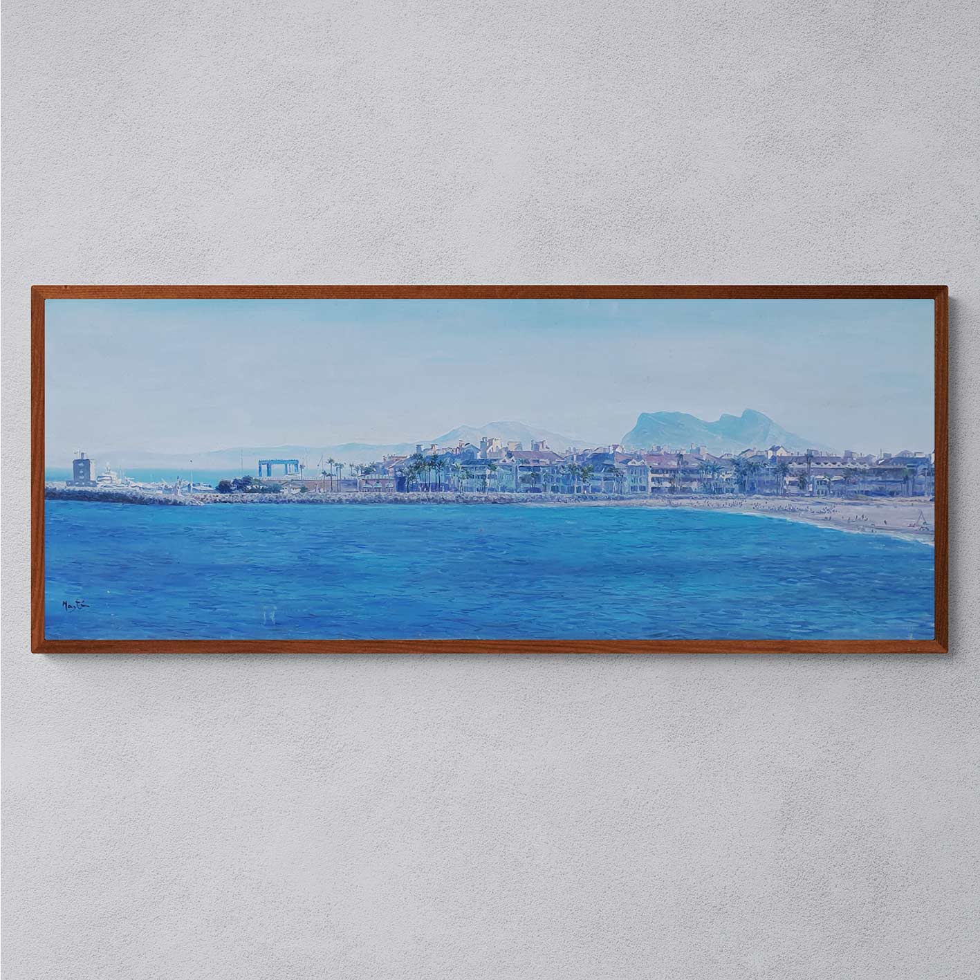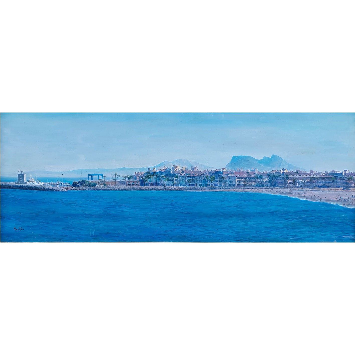 120Pintura el Peñón En Sotogrande, ein Original-Ölgemälde des Künstlers Martin de la Bahía aus der andalusischen Küstenstadt Sotogrande, ist ein großartiges Beispiel spanischer Kunst. Dieses einzigartige Gemälde spiegelt die Stile und Techniken der Küstenregion wider und ist somit eine interessante und besondere Ergänzung für jedes Zuhause oder jede Sammlung.
