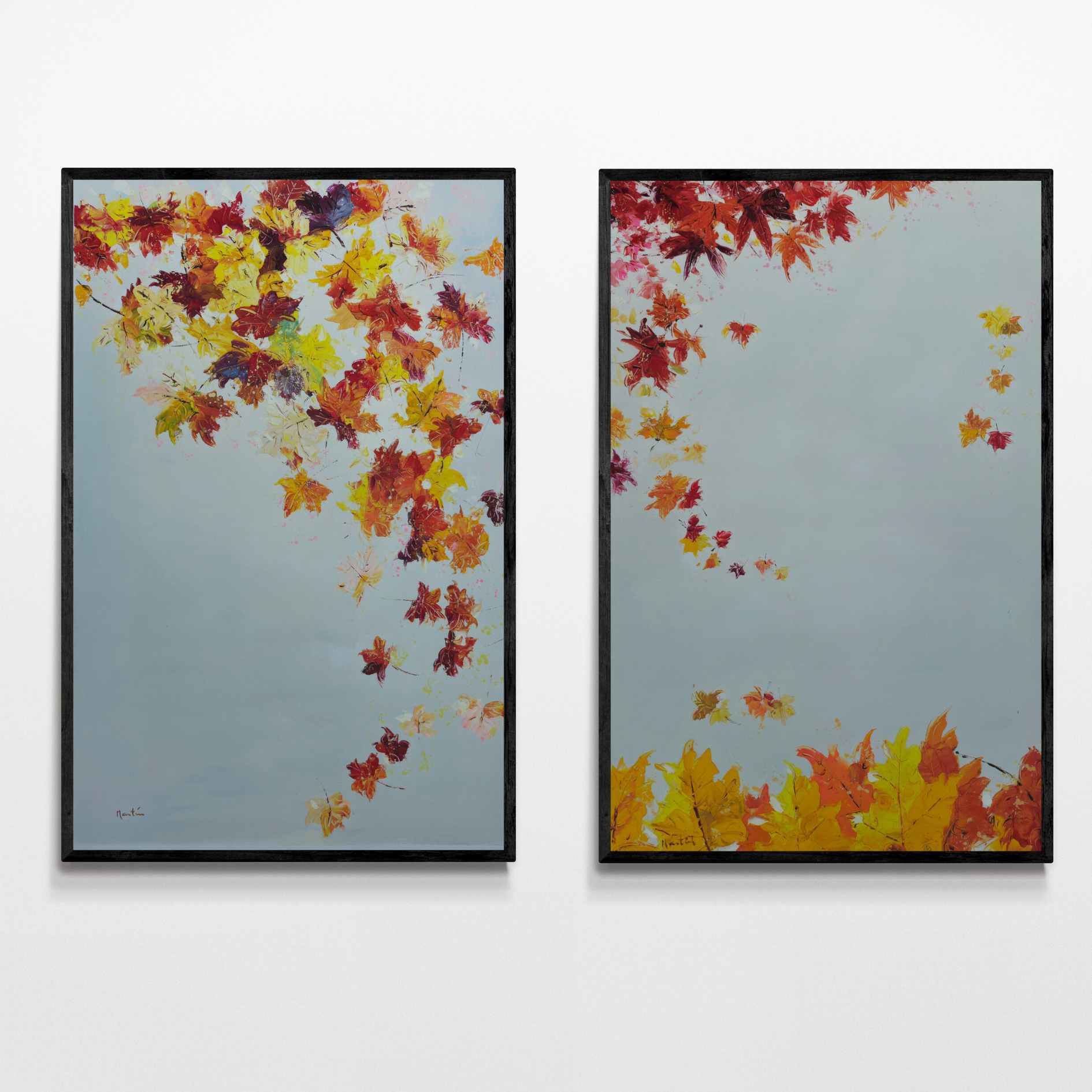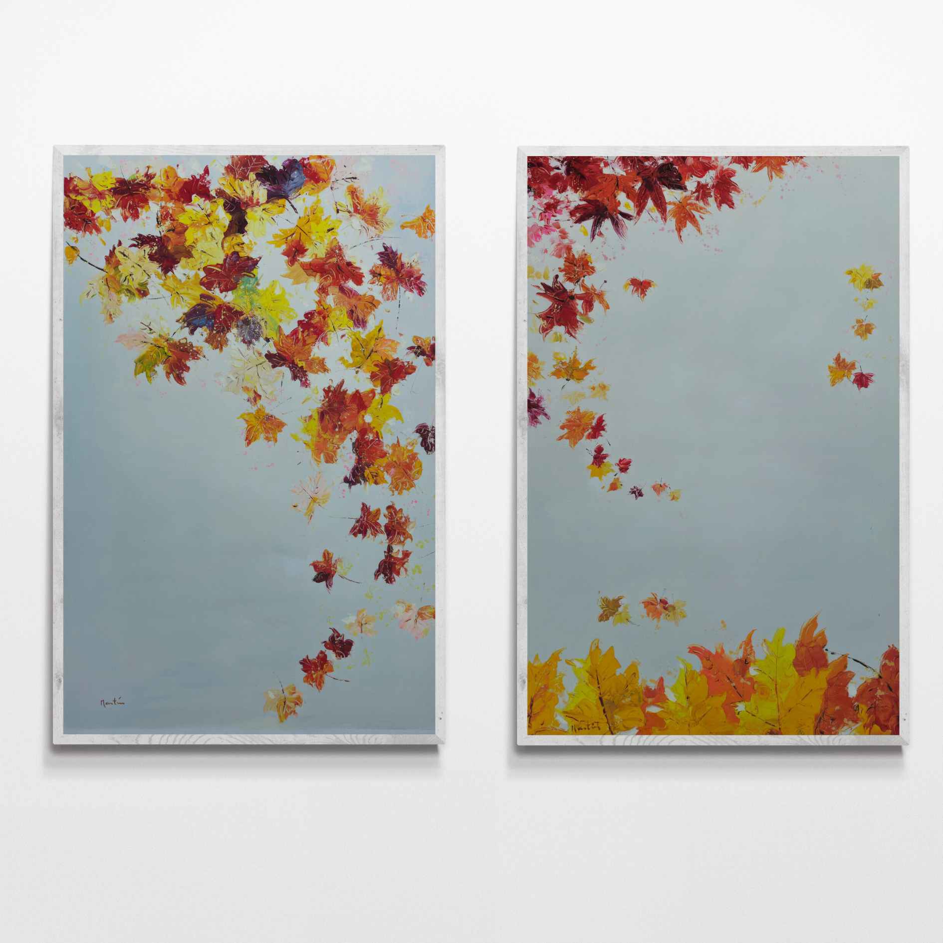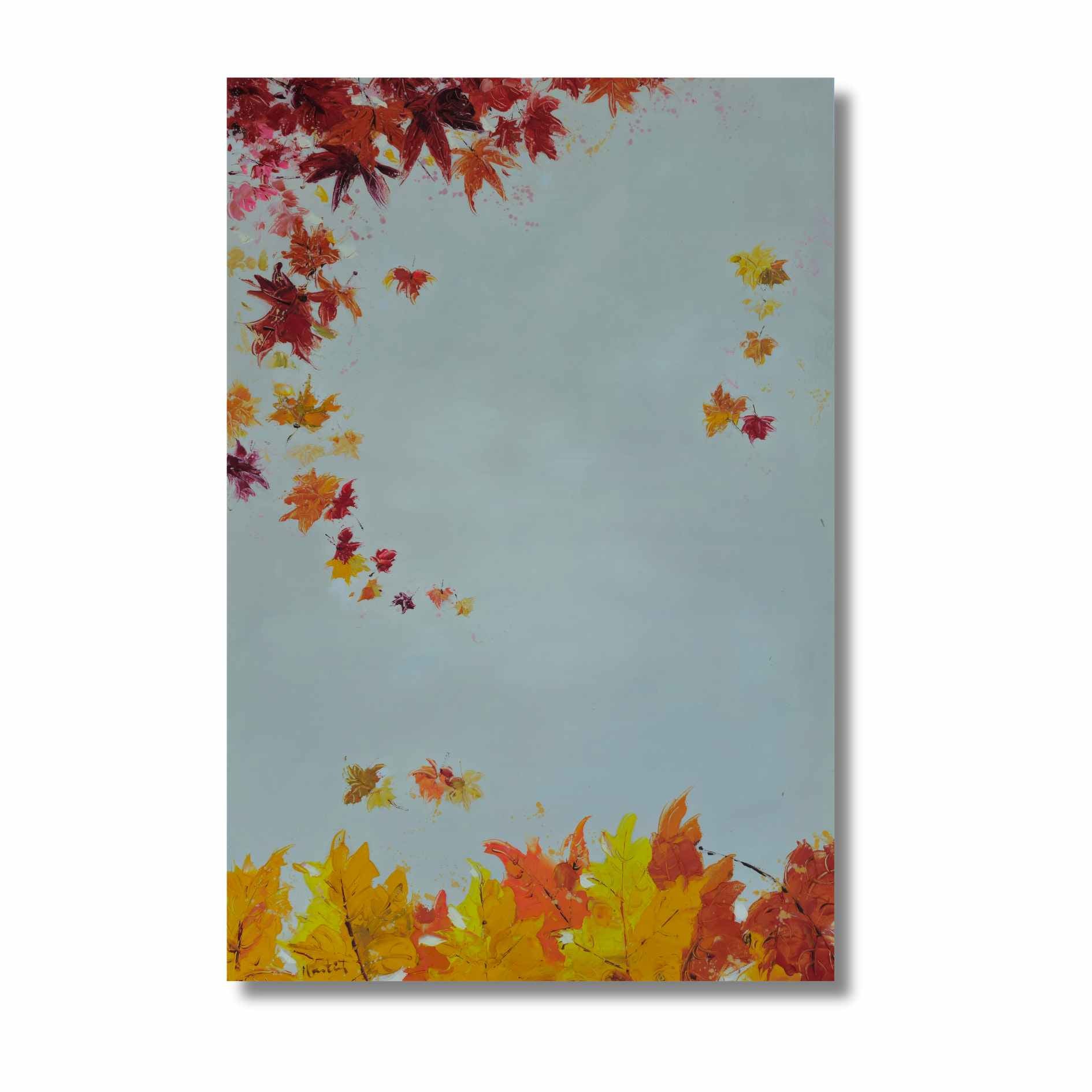 Bringen Sie die Schönheit des Herbstes in Ihr Zuhause mit diesem Set aus zwei Ölgemälden von Fall in Autumn Painting. Jedes 70 x 110 cm große Gemälde fängt den Charme fallender Blätter auf weißem Hintergrund ein. Verleihen Sie jedem Raum mit diesem Werk des Künstlers Martin einen Hauch von Eleganz und Wärme.