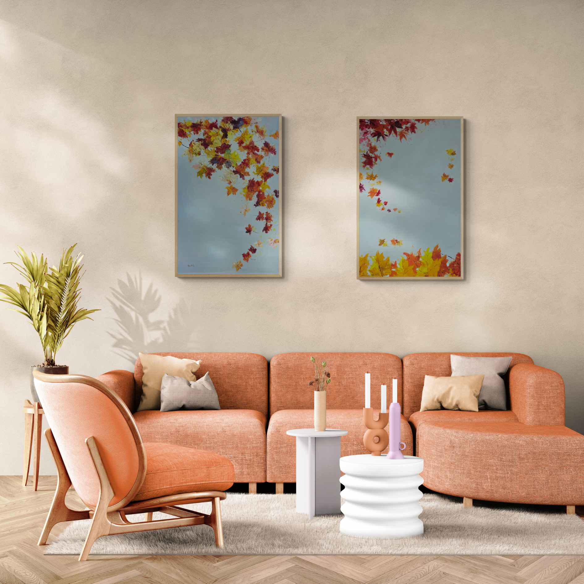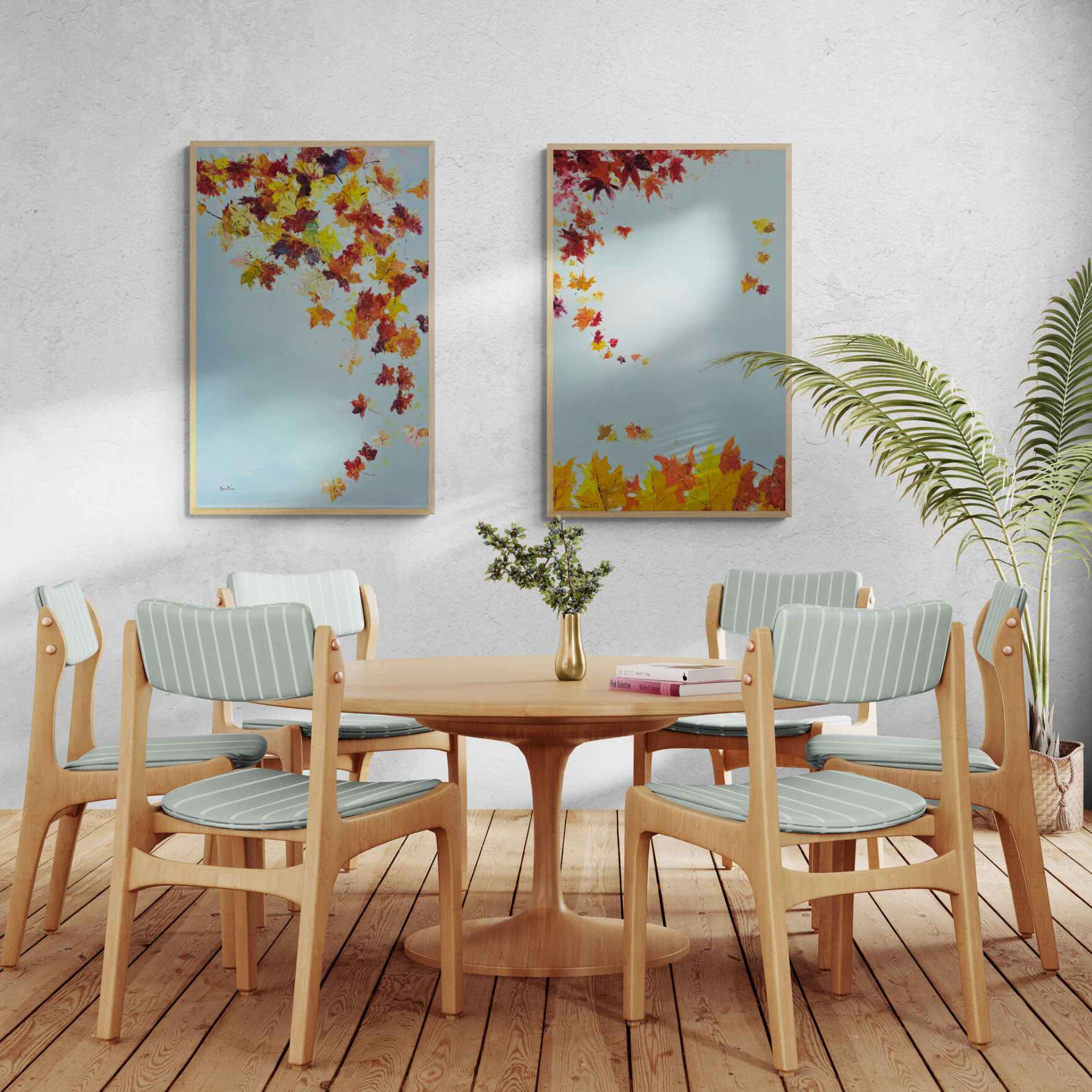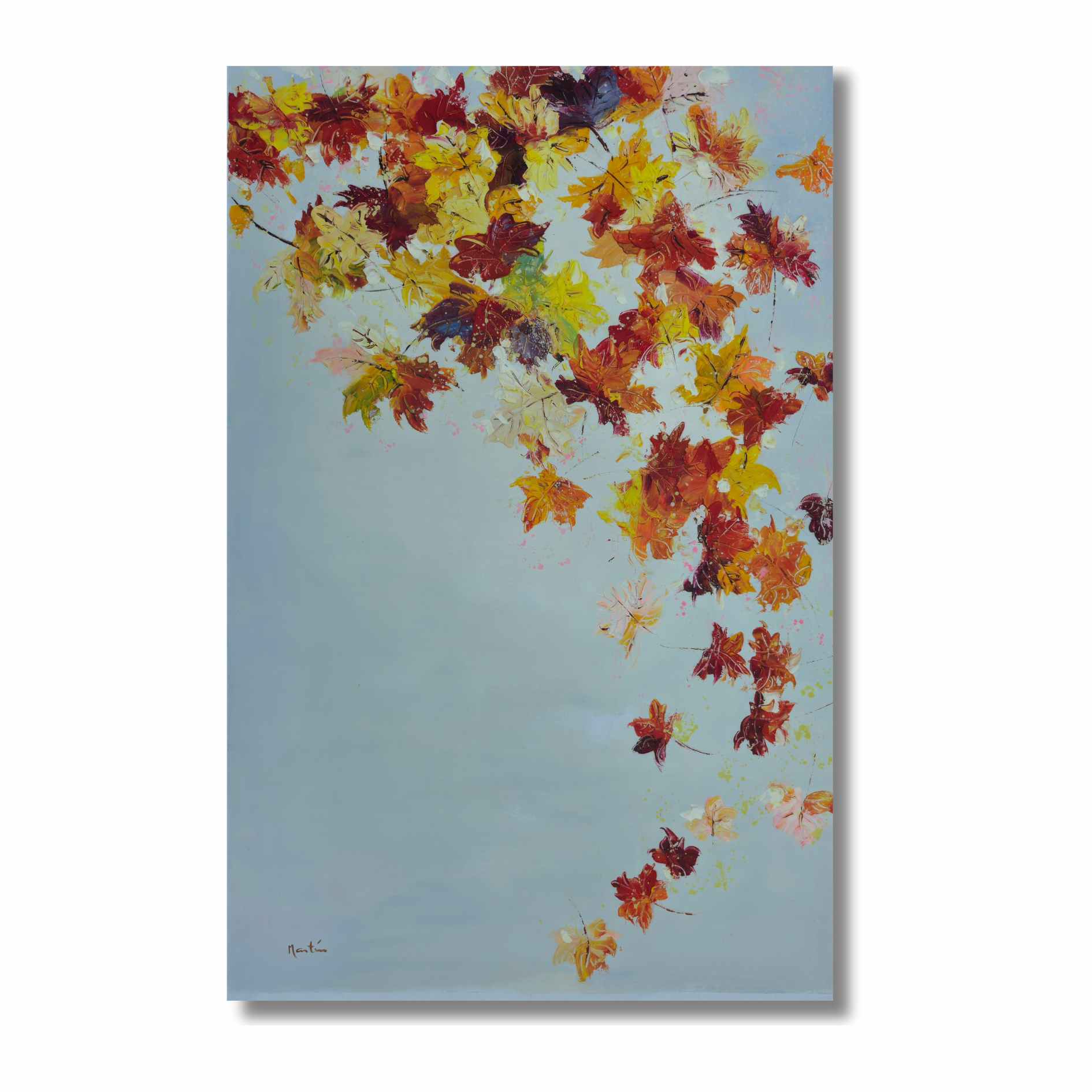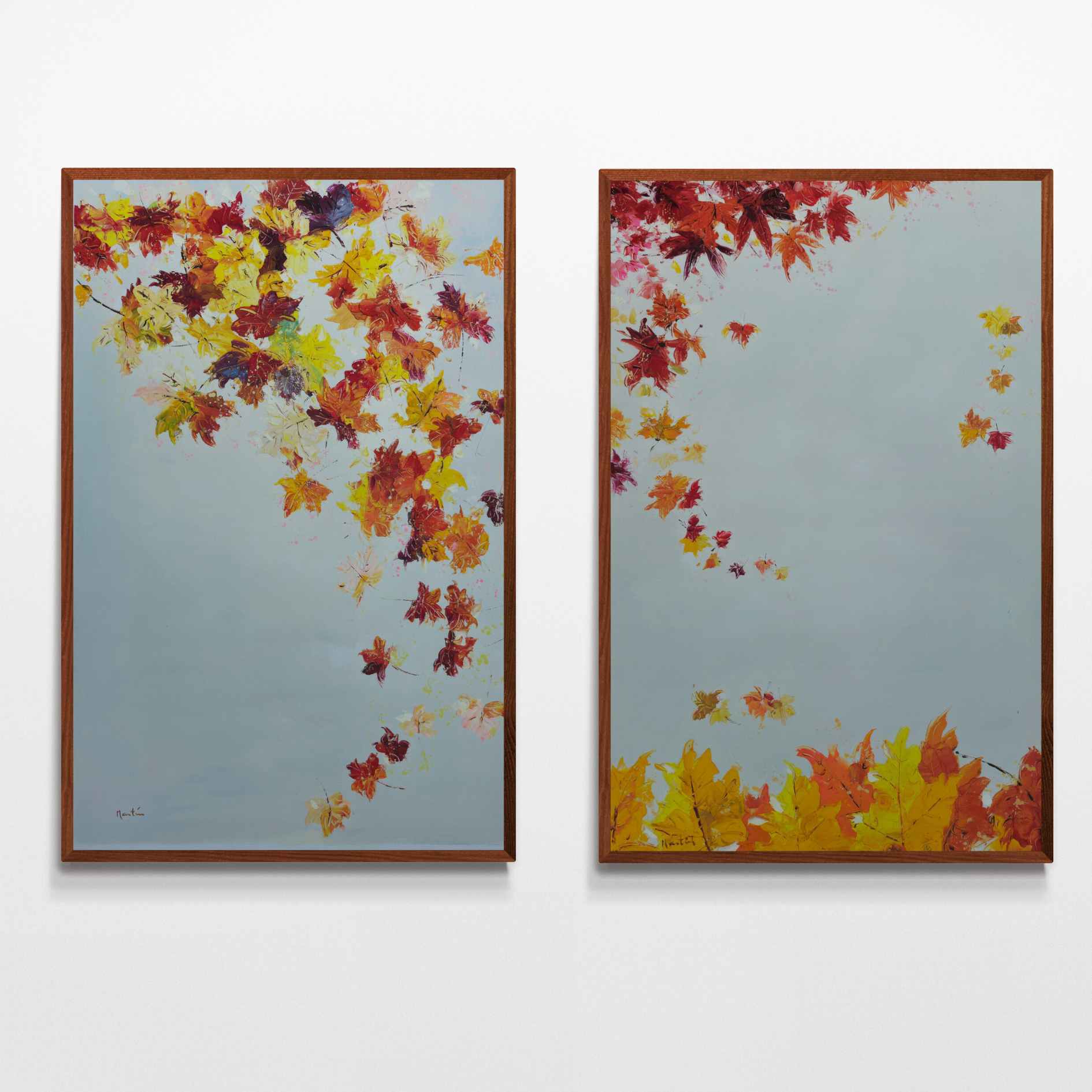 Bringen Sie die Schönheit des Herbstes in Ihr Zuhause mit diesem Set aus zwei Ölgemälden von Fall in Autumn Painting. Jedes 70 x 110 cm große Gemälde fängt den Charme fallender Blätter auf weißem Hintergrund ein. Verleihen Sie jedem Raum mit diesem Werk des Künstlers Martin einen Hauch von Eleganz und Wärme.