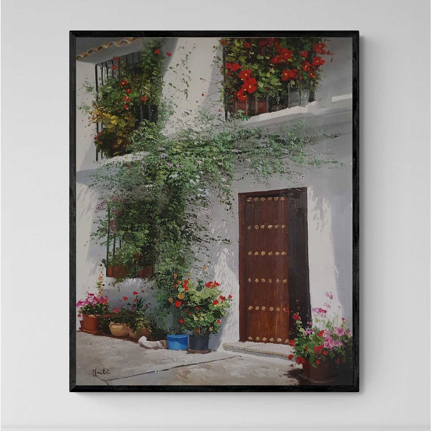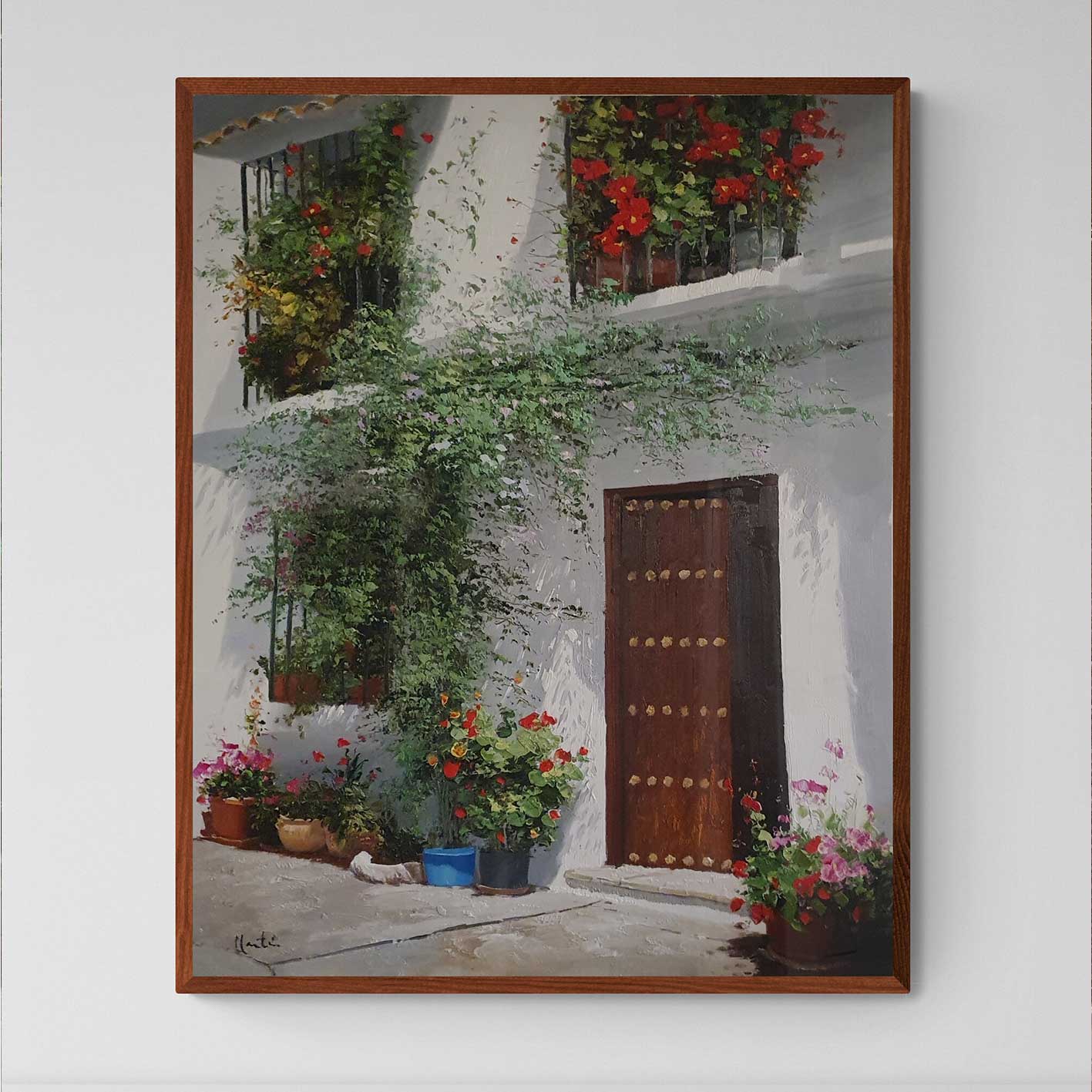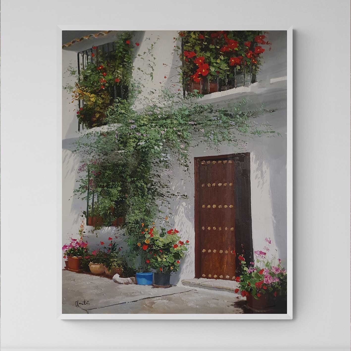 Inspiriert von einer typisch andalusischen Dorfstraße präsentiert dieses einzigartige und originelle Ölgemälde von Martín eine beeindruckende Farbpalette mit Töpfen und Pflanzen mit endlosen Details.