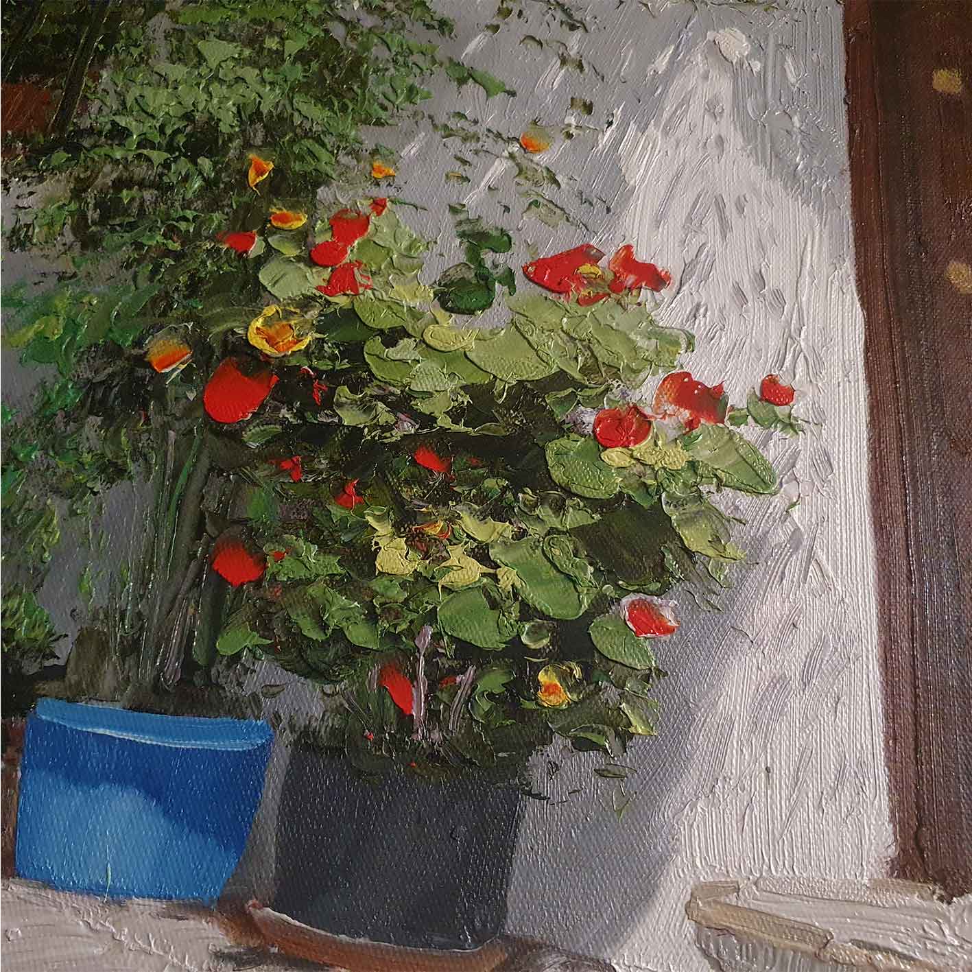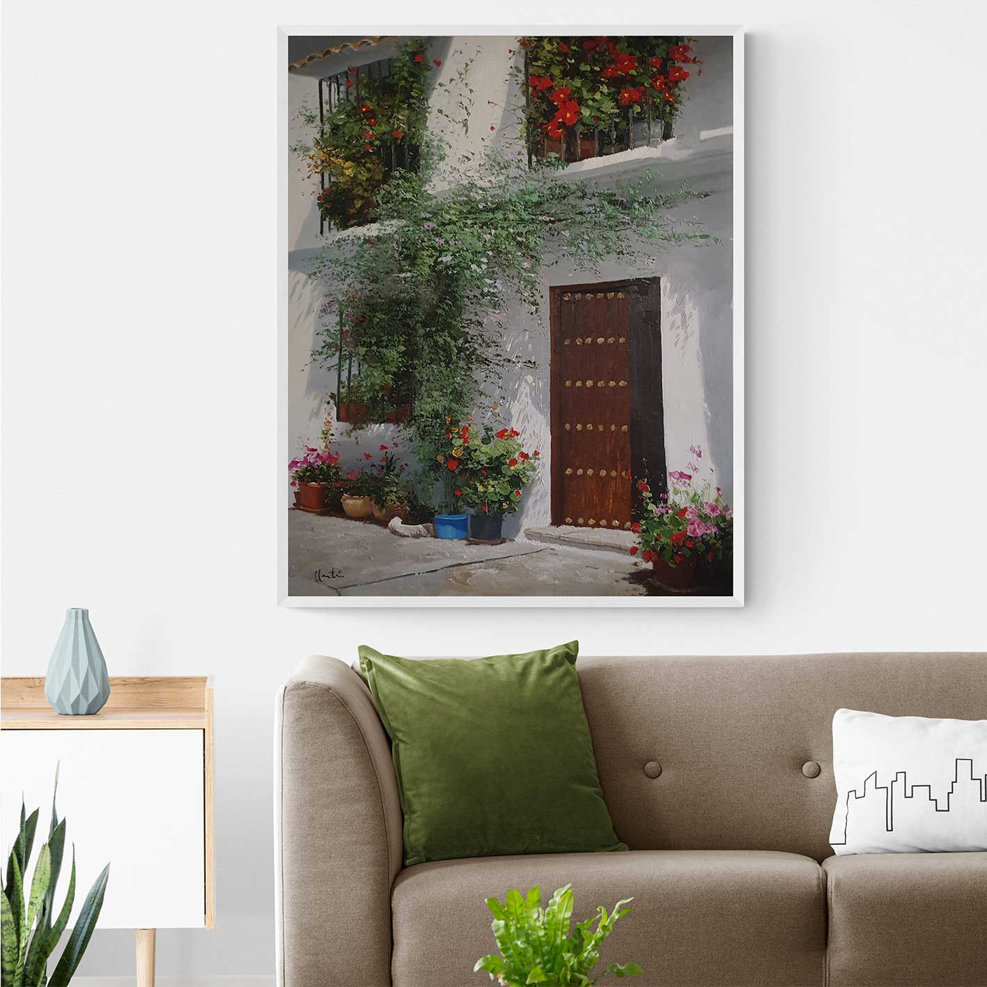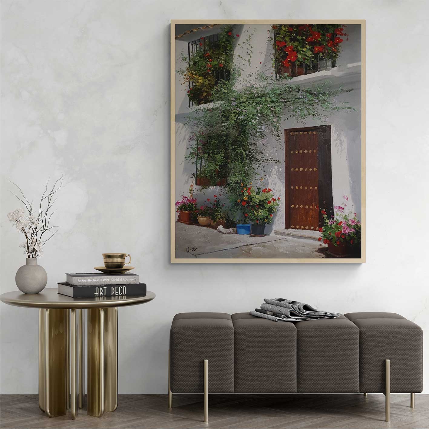 Inspiriert von einer typisch andalusischen Dorfstraße präsentiert dieses einzigartige und originelle Ölgemälde von Martín eine beeindruckende Farbpalette mit Töpfen und Pflanzen mit endlosen Details.