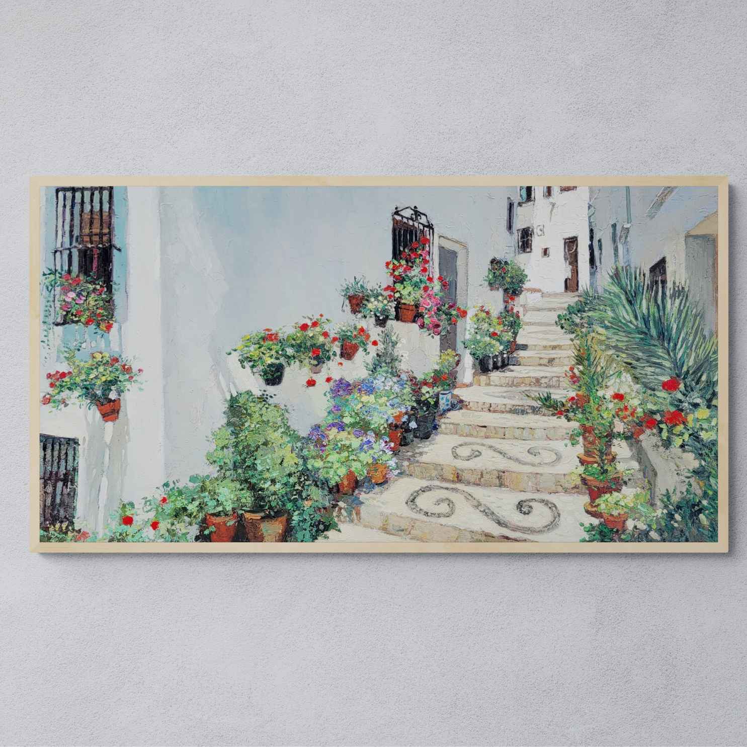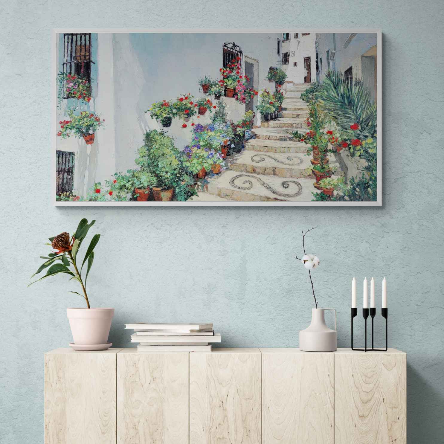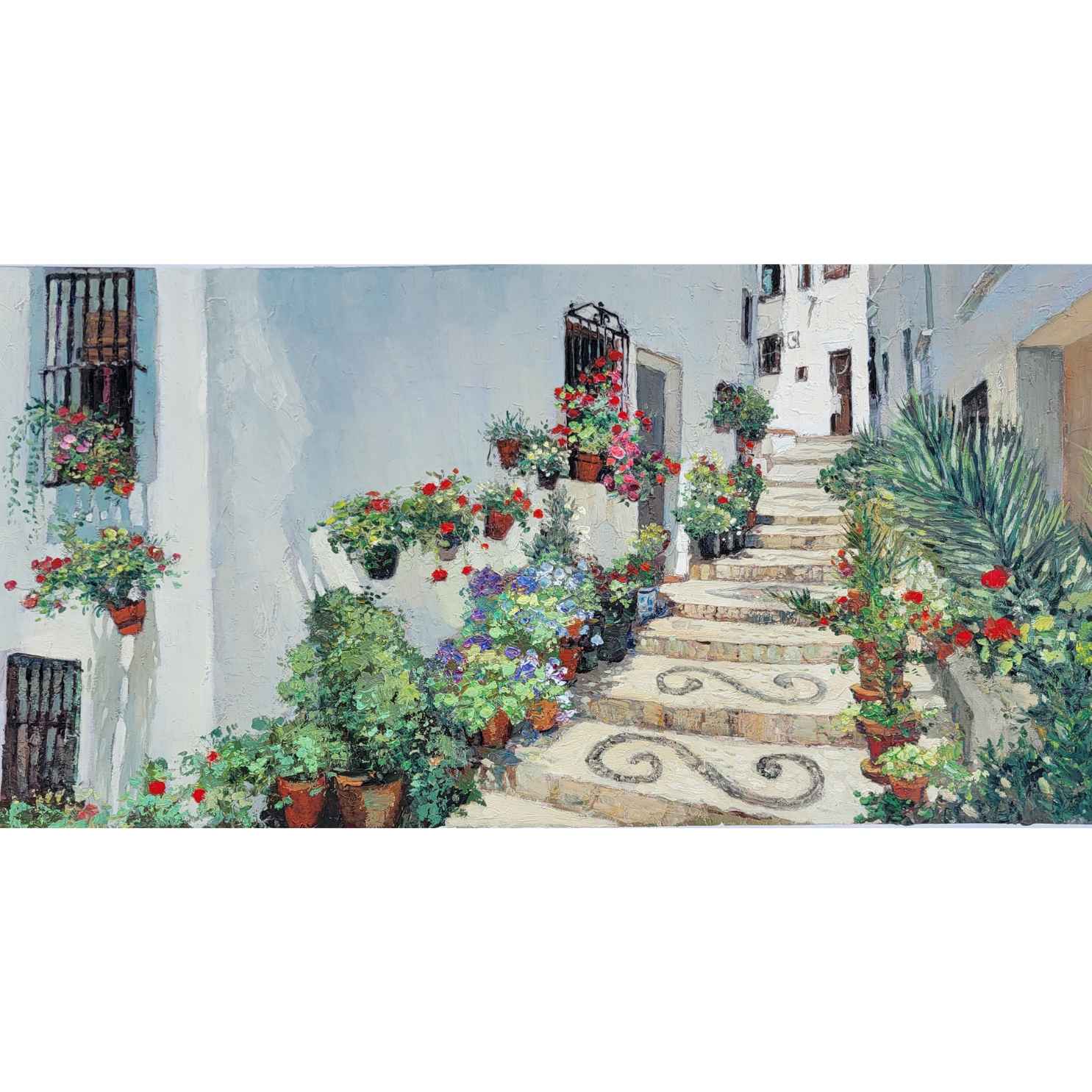 Dieses wunderschöne Gemälde der Escalera del Pueblo ist ein einzigartiges und originelles Kunstwerk, das eine Straße in einer andalusischen Stadt mit vielen Blumen und Töpfen widerspiegelt. Der Maler Martin hat es mit den besten Materialien gemacht, Öl auf Leinwand. Das Gemälde ist ein Wunder, das jedes Zuhause mit Charme erfüllen wird.