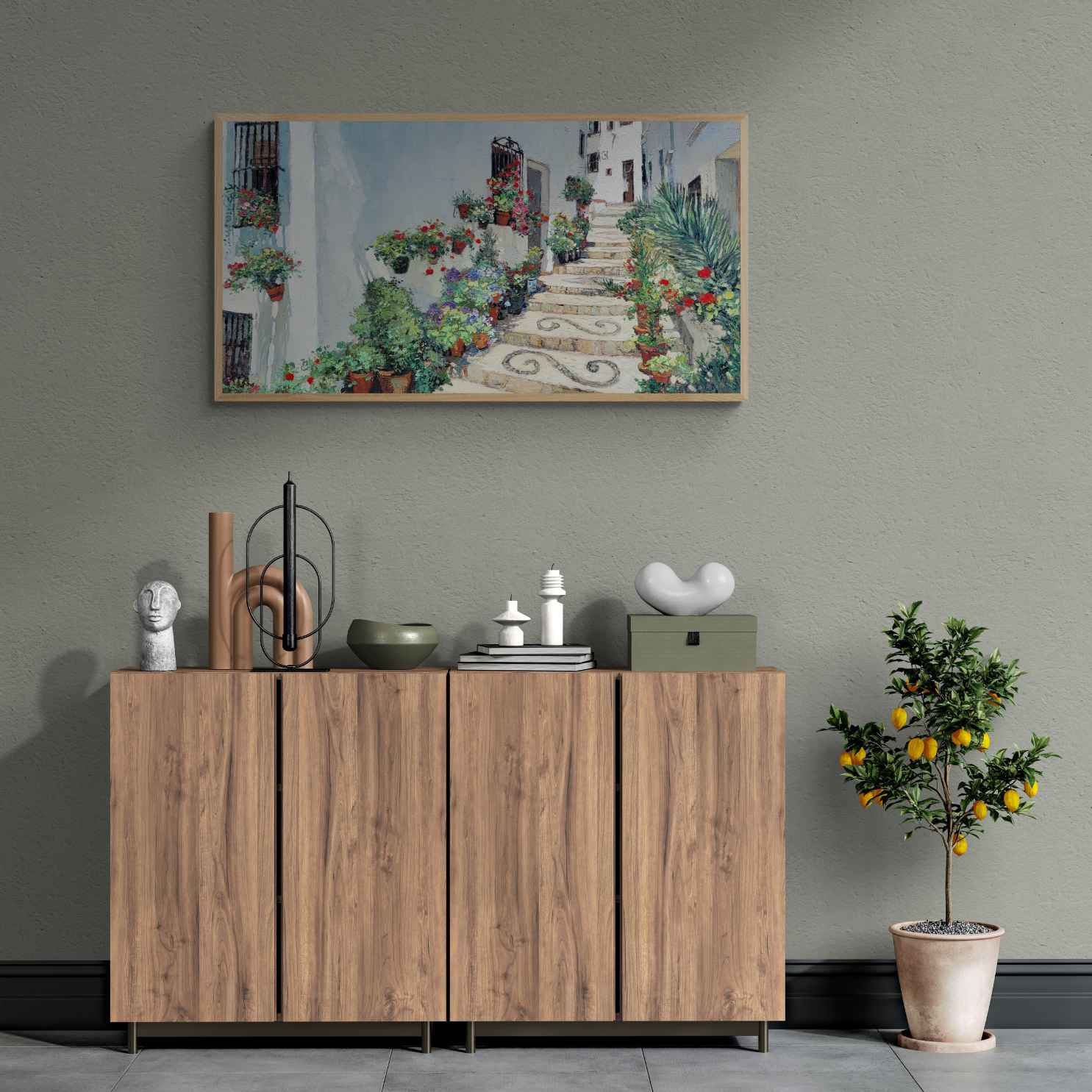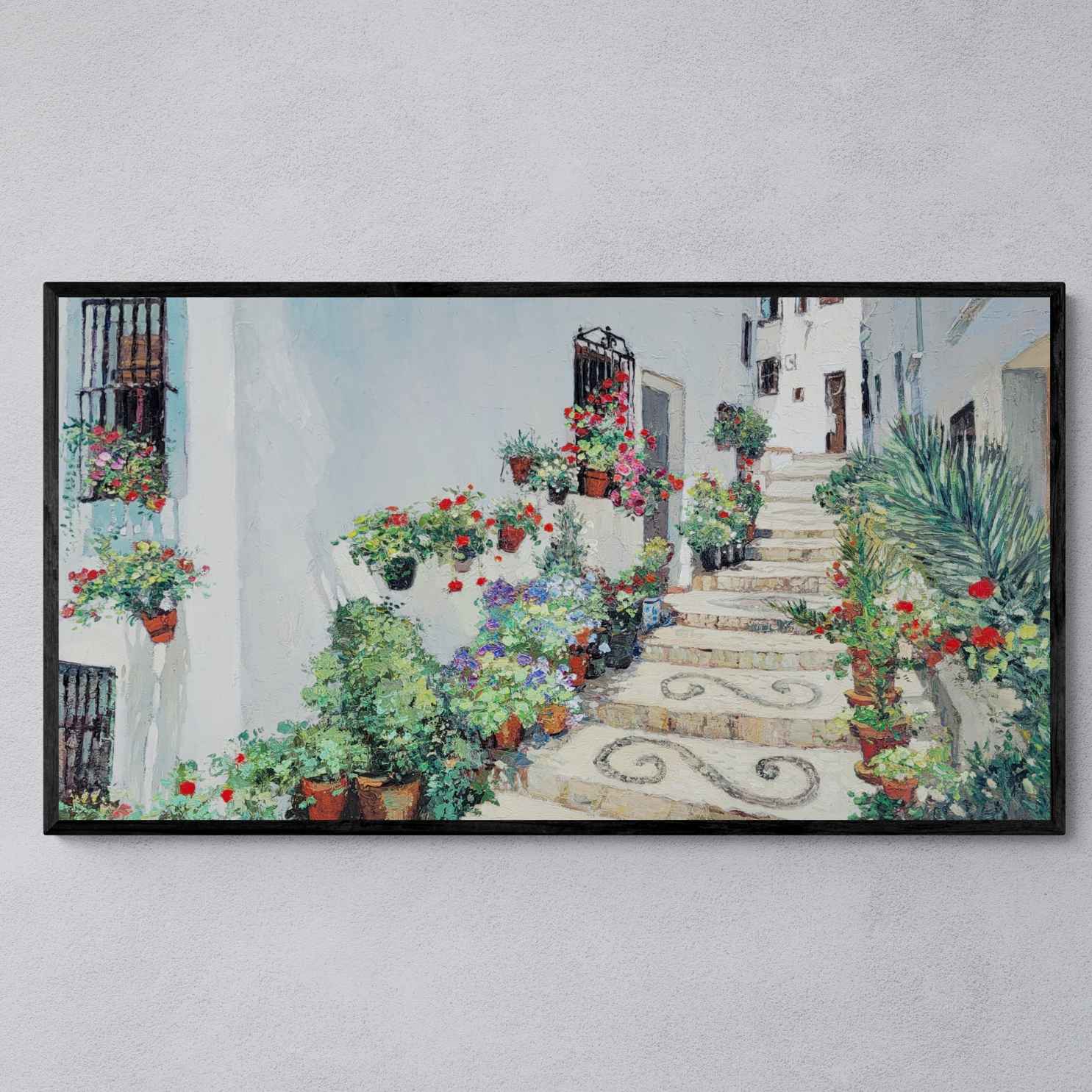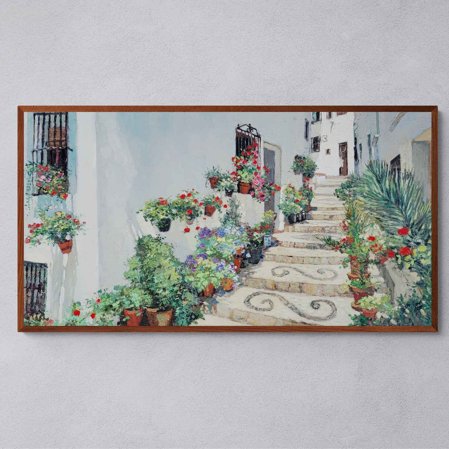 Dieses wunderschöne Gemälde der Escalera del Pueblo ist ein einzigartiges und originelles Kunstwerk, das eine Straße in einer andalusischen Stadt mit vielen Blumen und Töpfen widerspiegelt. Der Maler Martin hat es mit den besten Materialien gemacht, Öl auf Leinwand. Das Gemälde ist ein Wunder, das jedes Zuhause mit Charme erfüllen wird.