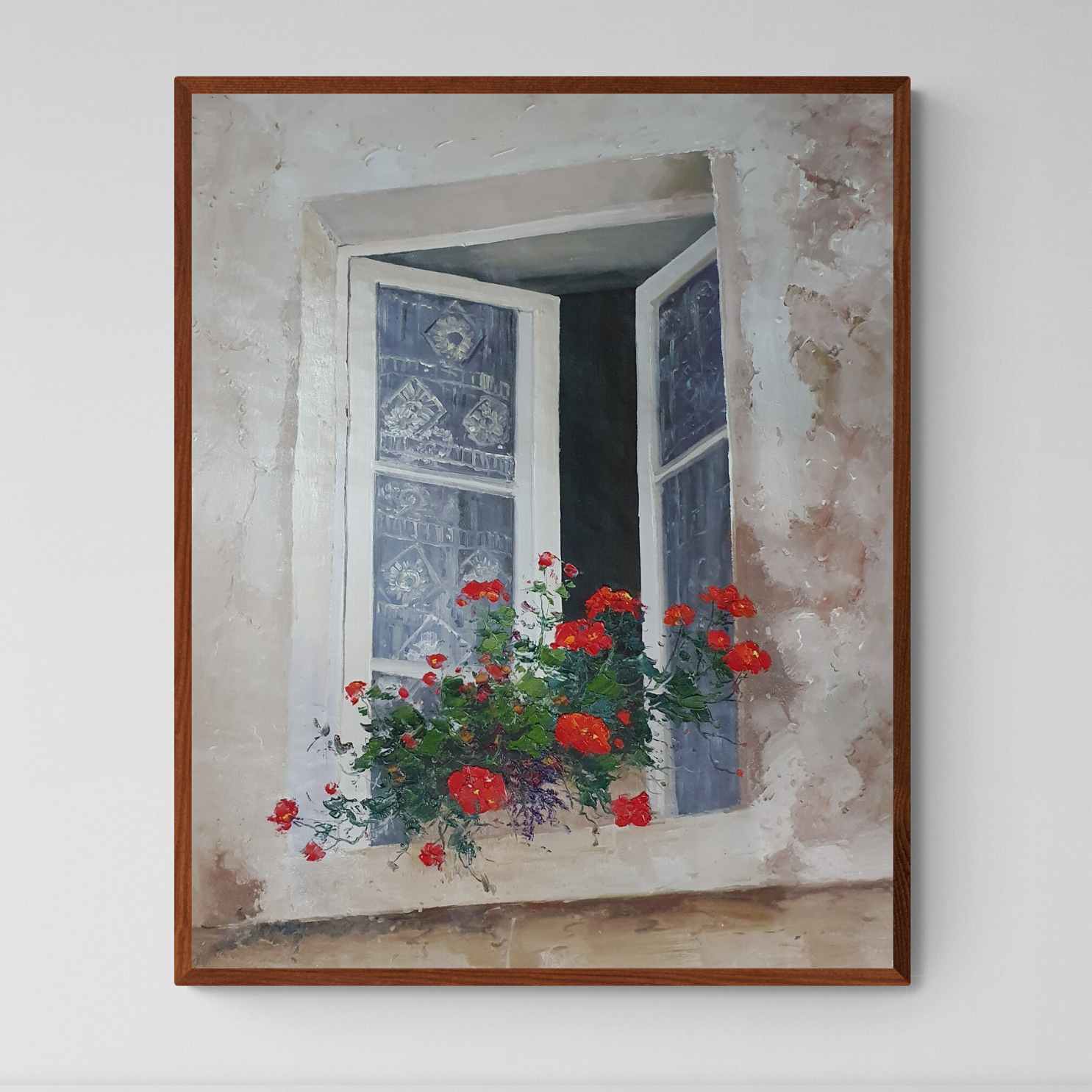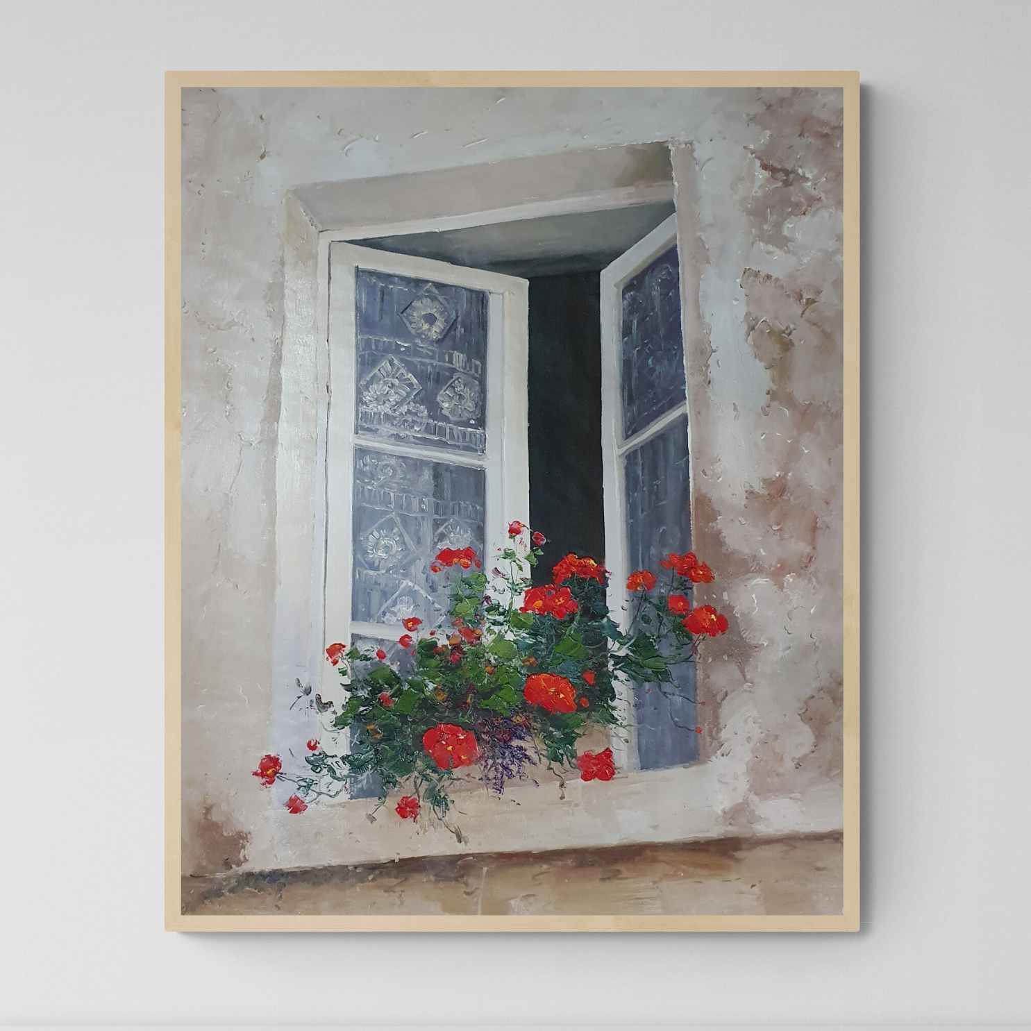 Der Künstler Martin hat mit Ölfarbe ein stimmungsvolles Gemälde eines Fensters mit attraktiven roten Blumen geschaffen. Dieses Kunstwerk wird Sie in die Natur entführen und Ihnen eine emotionale Verbindung mit der Schönheit des Lebens bieten.