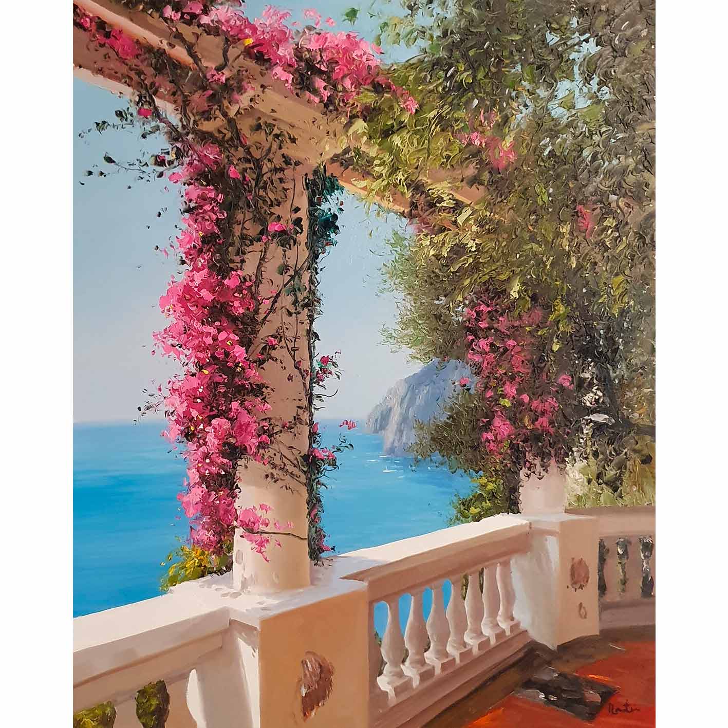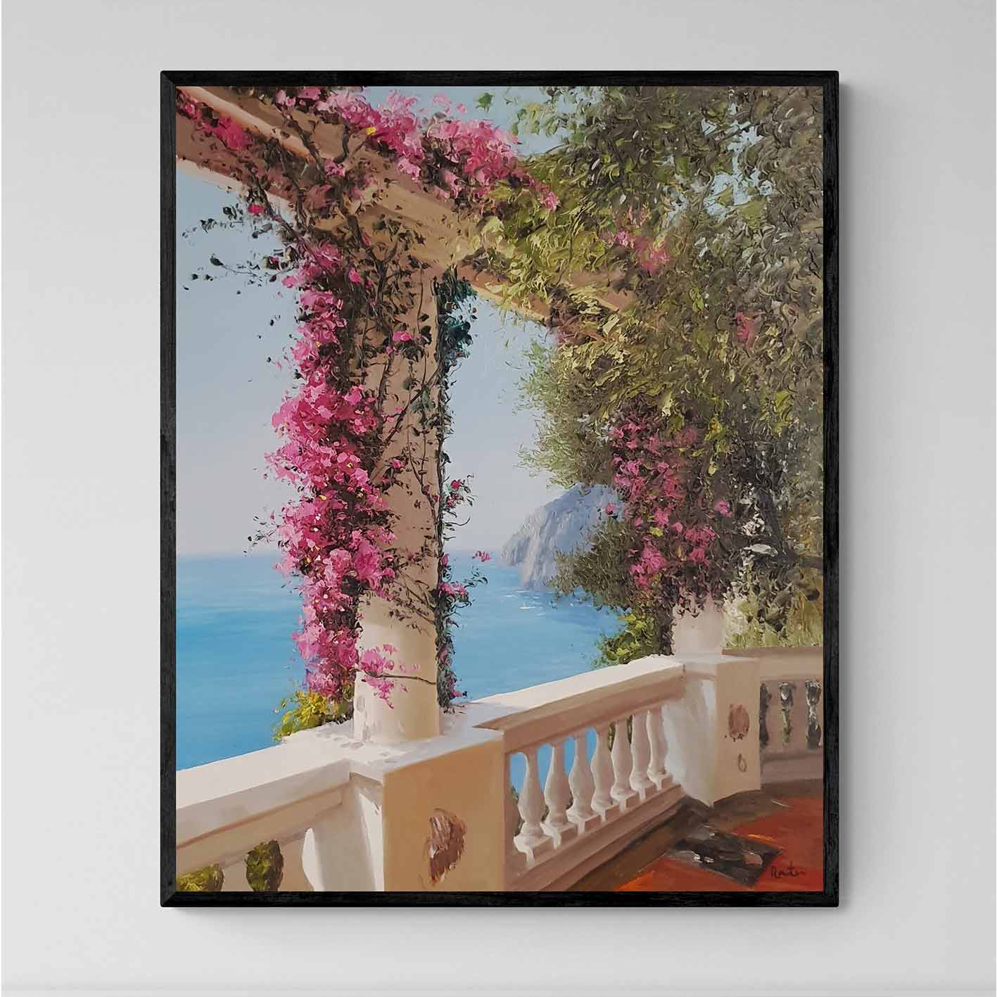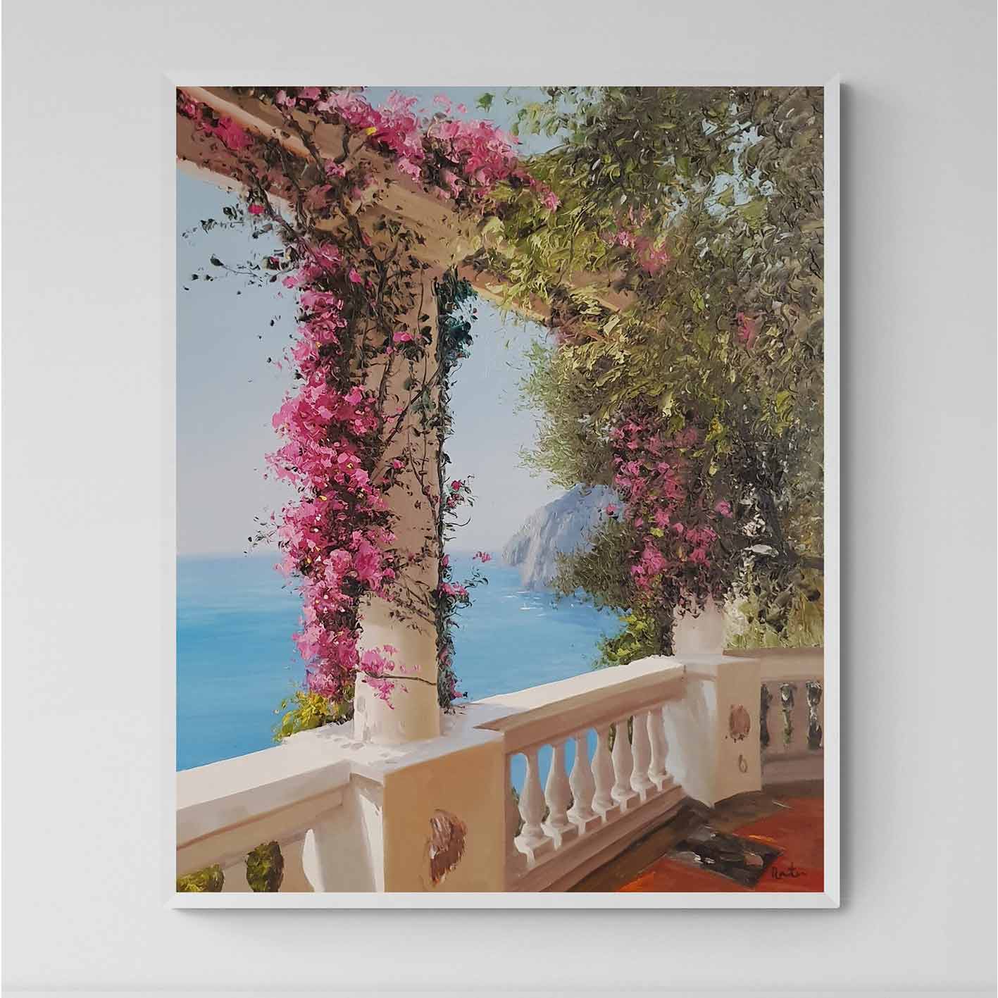 Martín präsentiert ein einzigartiges und originelles Ölgemälde, The Views. Dieses Werk zeigt einen spektakulären Balkon mit Aussicht, umgeben von einer prächtigen rosa Bougainvillea. Ideal für jedes Zuhause.