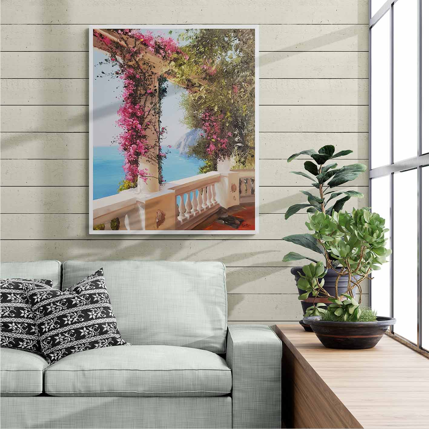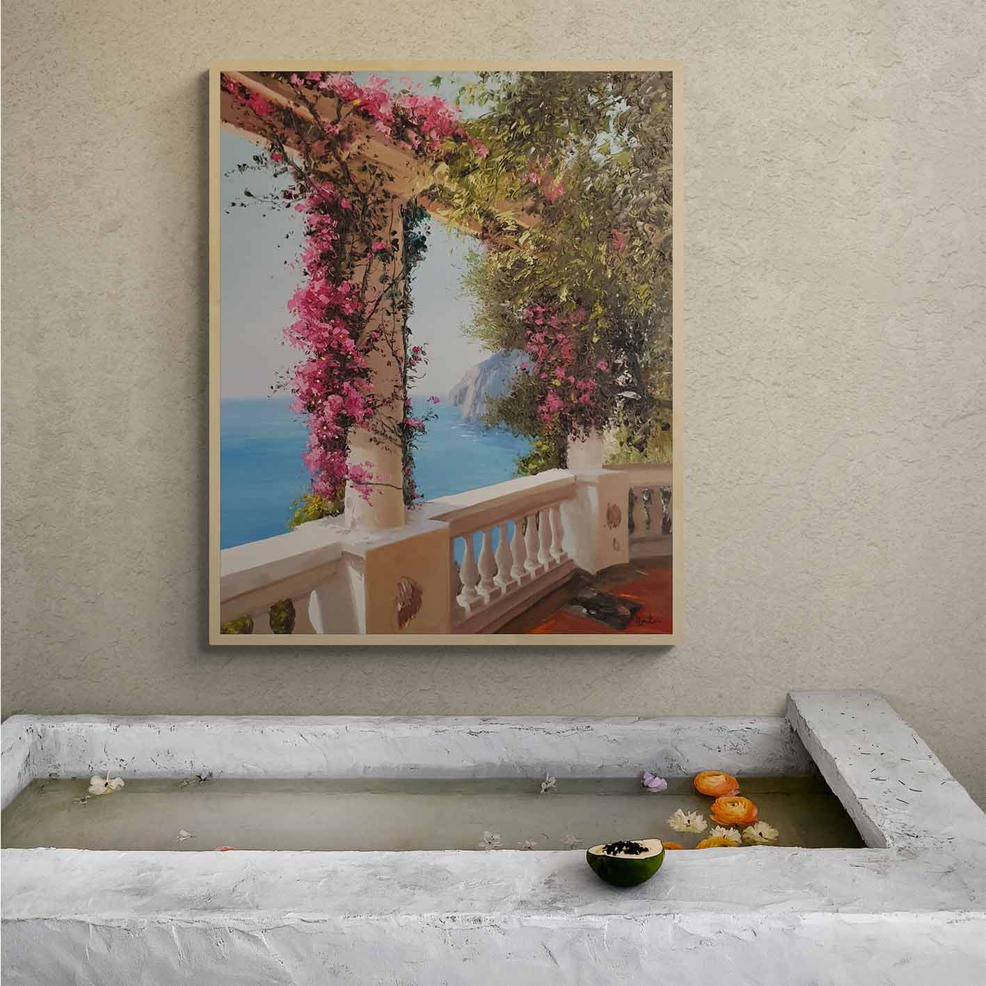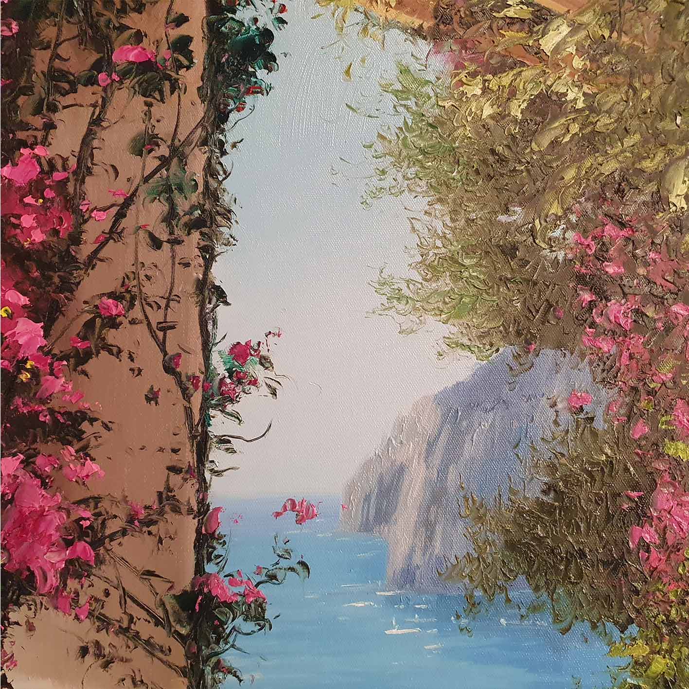 Martín präsentiert ein einzigartiges und originelles Ölgemälde, The Views. Dieses Werk zeigt einen spektakulären Balkon mit Aussicht, umgeben von einer prächtigen rosa Bougainvillea. Ideal für jedes Zuhause.