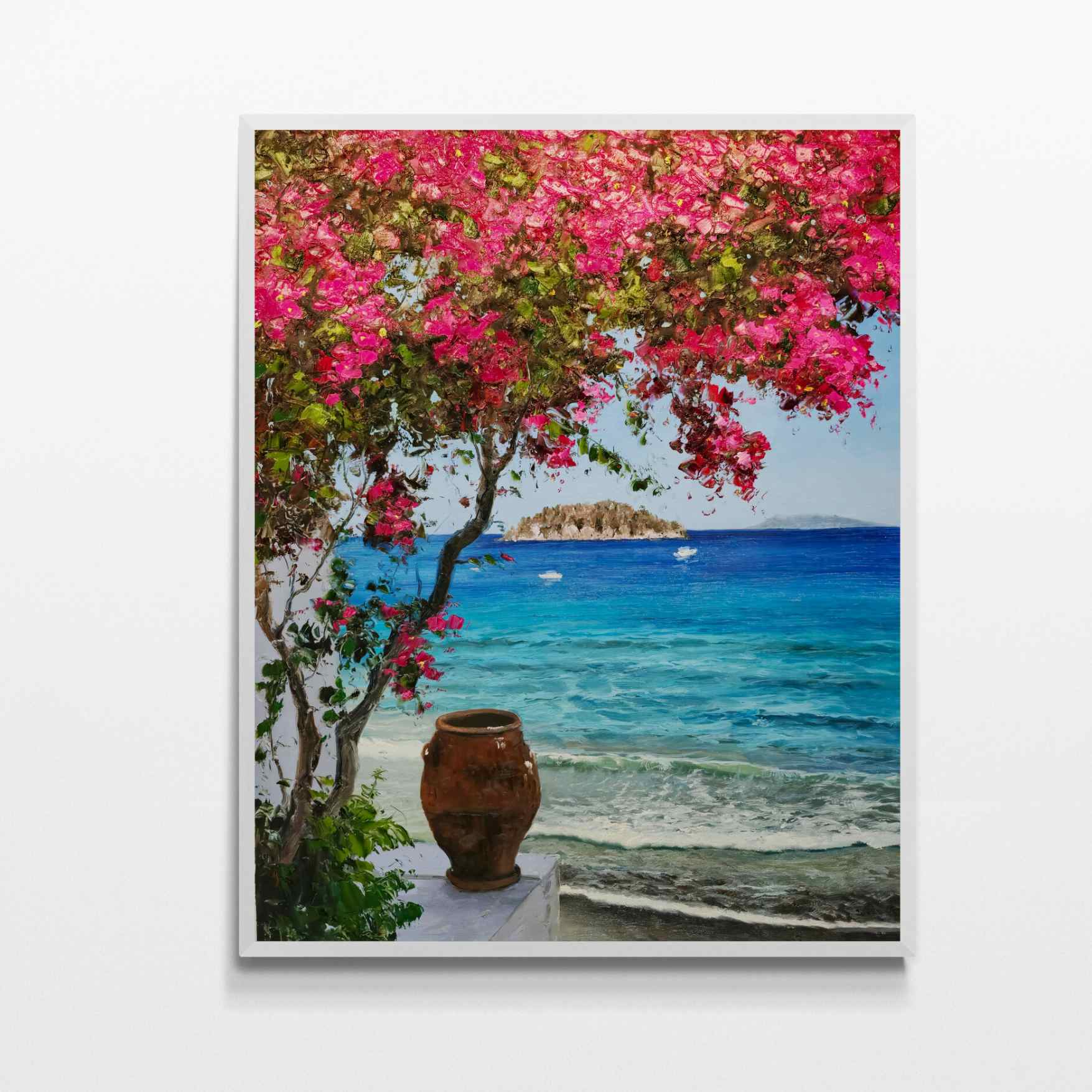 Verwandeln Sie Ihr Zuhause mit unserem wunderschönen handgemalten Bougainvillea-Ölgemälde mit Meerblick! Jeder von Hand gefertigte Strich verleiht Ihrem Raum einen Hauch von Farbe und Leben, während der Meerblick Sie an einen Ort der Ruhe und Gelassenheit entführt. Ein einzigartiges Kunstwerk für Ihr Zuhause.