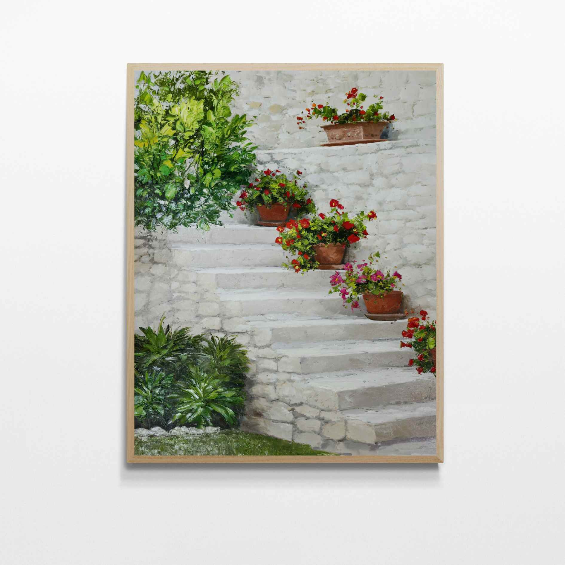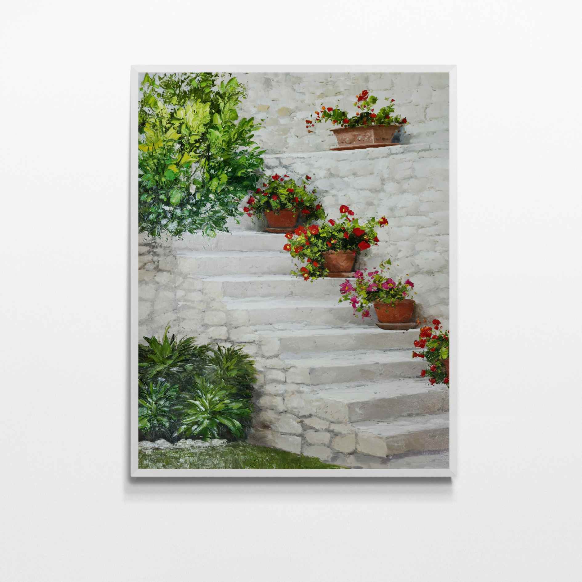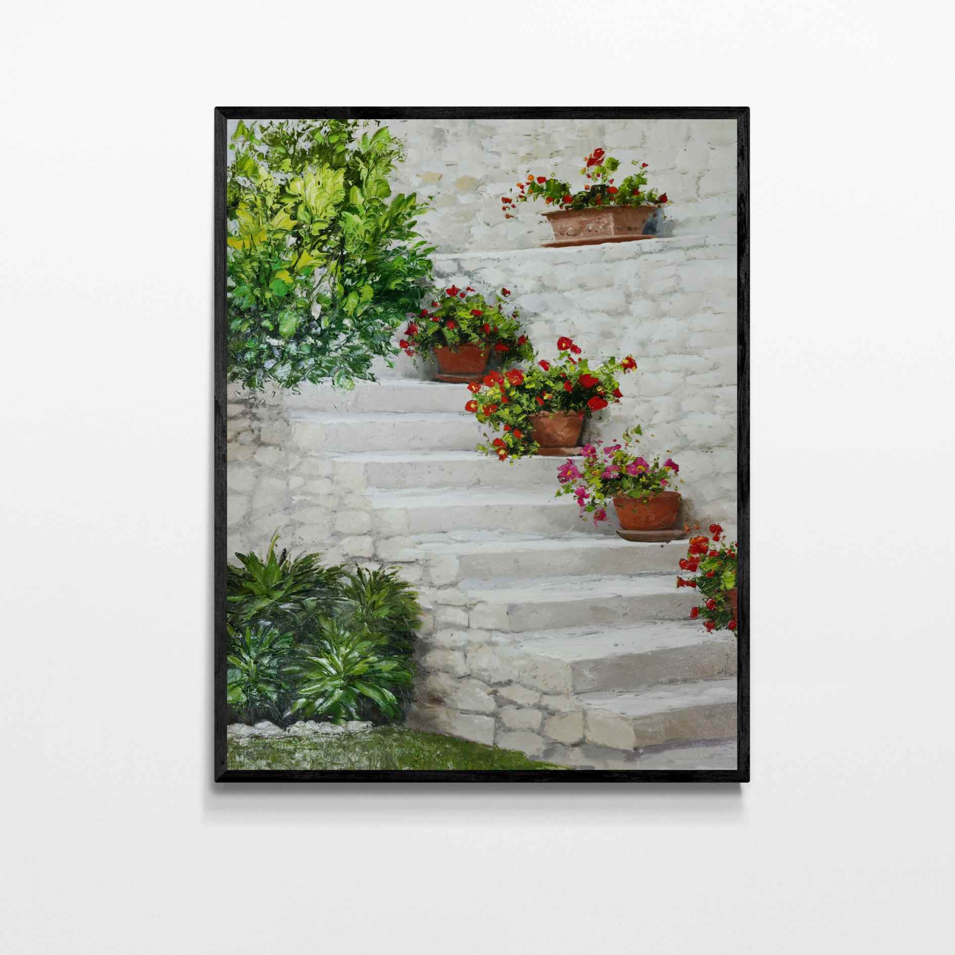 Genießen Sie die Schönheit Südspaniens mit diesem wunderschönen Ölgemälde einer andalusischen Treppe, die auf jeder Stufe mit bunten Blumentöpfen geschmückt ist. Ein originelles und einzigartiges Stück, das jedem Raum einen Hauch von Charme verleiht. Füllen Sie Ihr Zuhause mit der Fülle der Pflanzen mit Pintura Las Plantas!