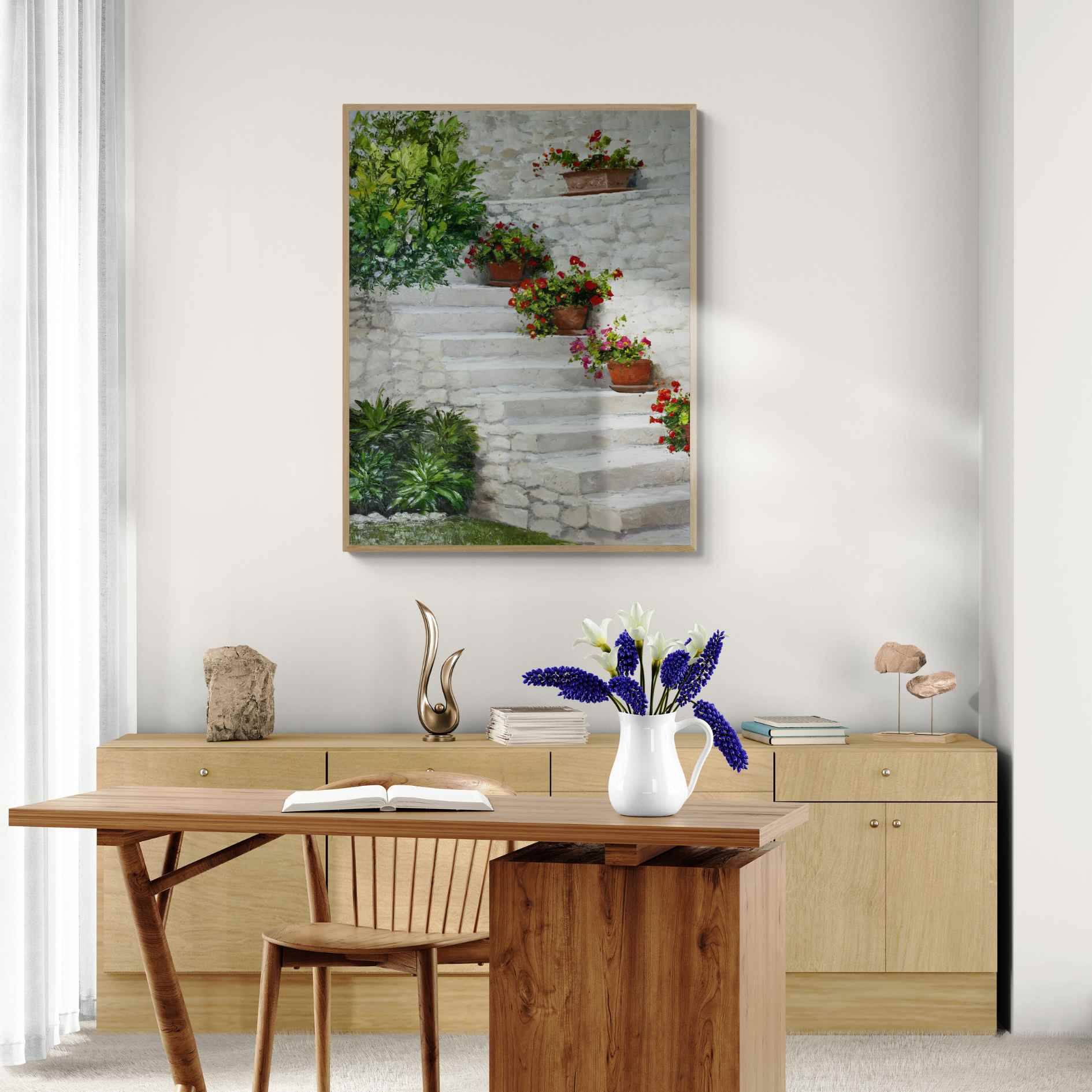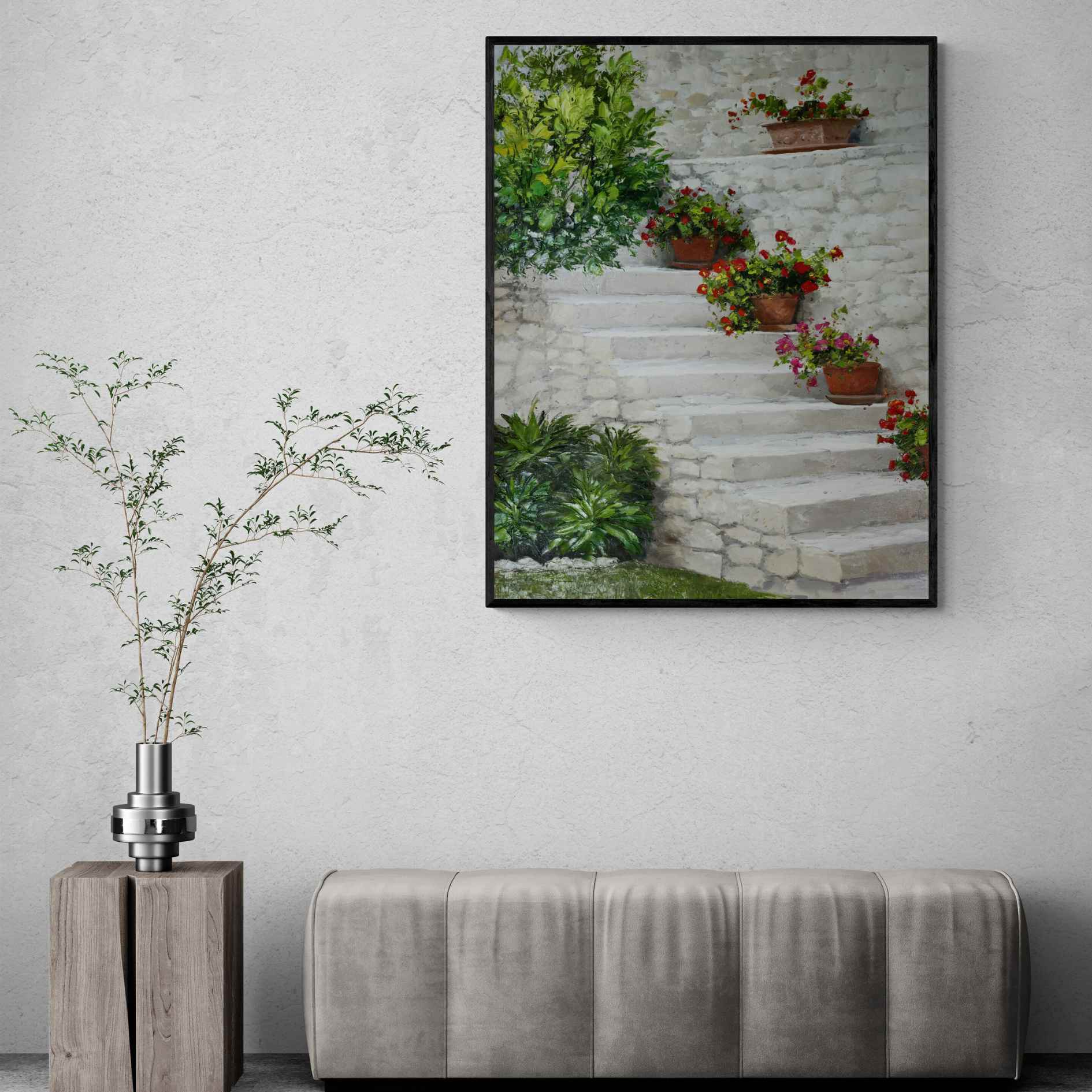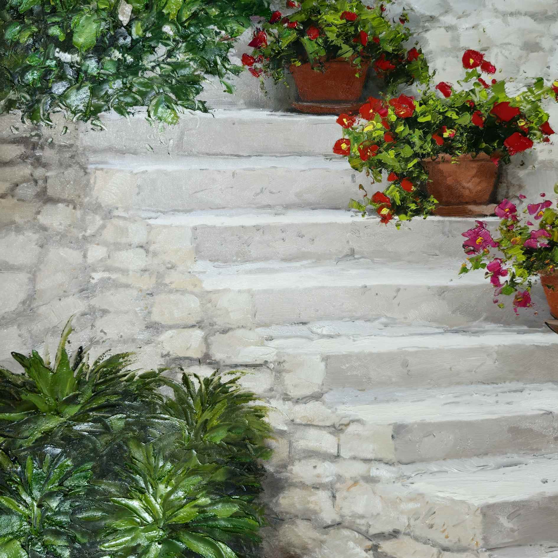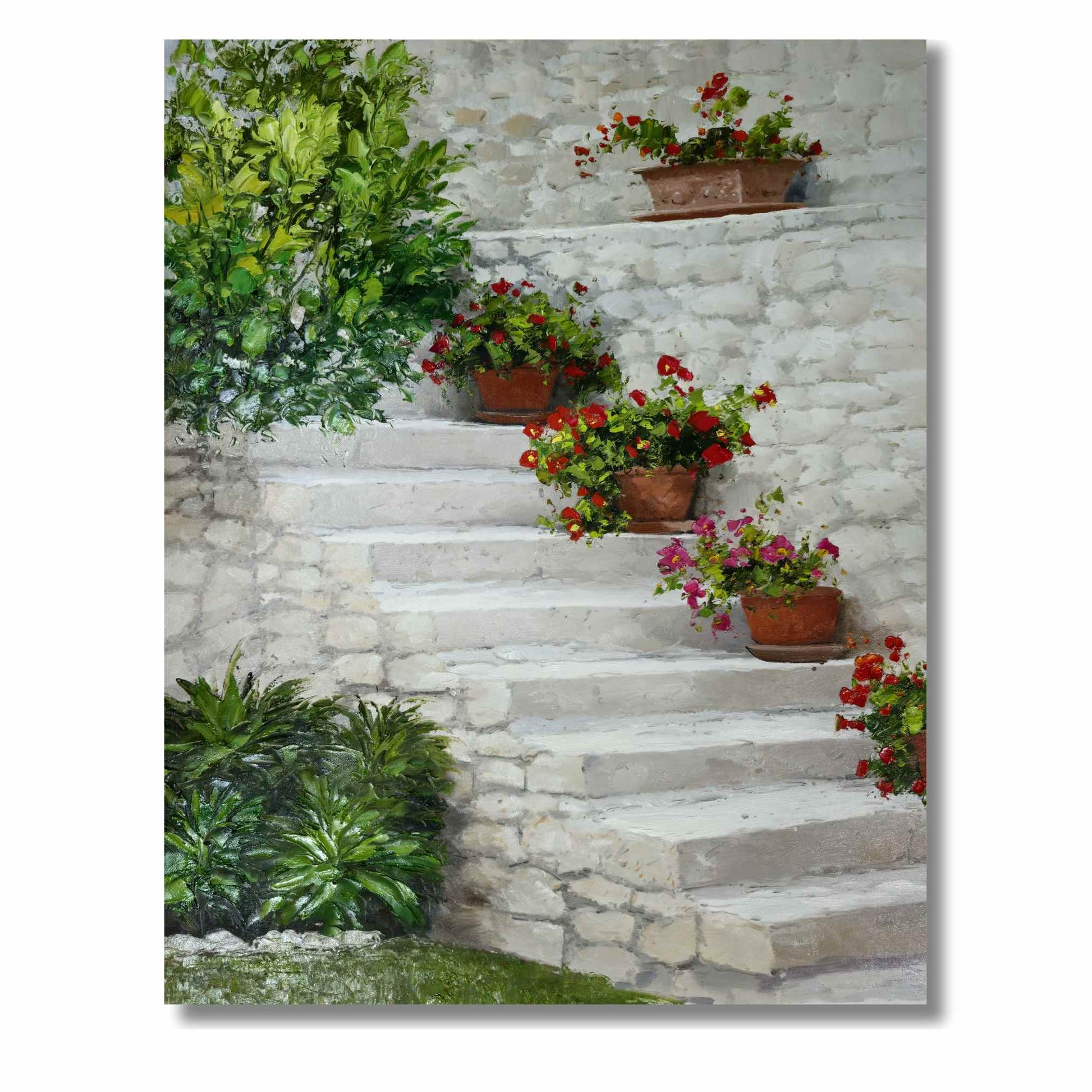 Genießen Sie die Schönheit Südspaniens mit diesem wunderschönen Ölgemälde einer andalusischen Treppe, die auf jeder Stufe mit bunten Blumentöpfen geschmückt ist. Ein originelles und einzigartiges Stück, das jedem Raum einen Hauch von Charme verleiht. Füllen Sie Ihr Zuhause mit der Fülle der Pflanzen mit Pintura Las Plantas!