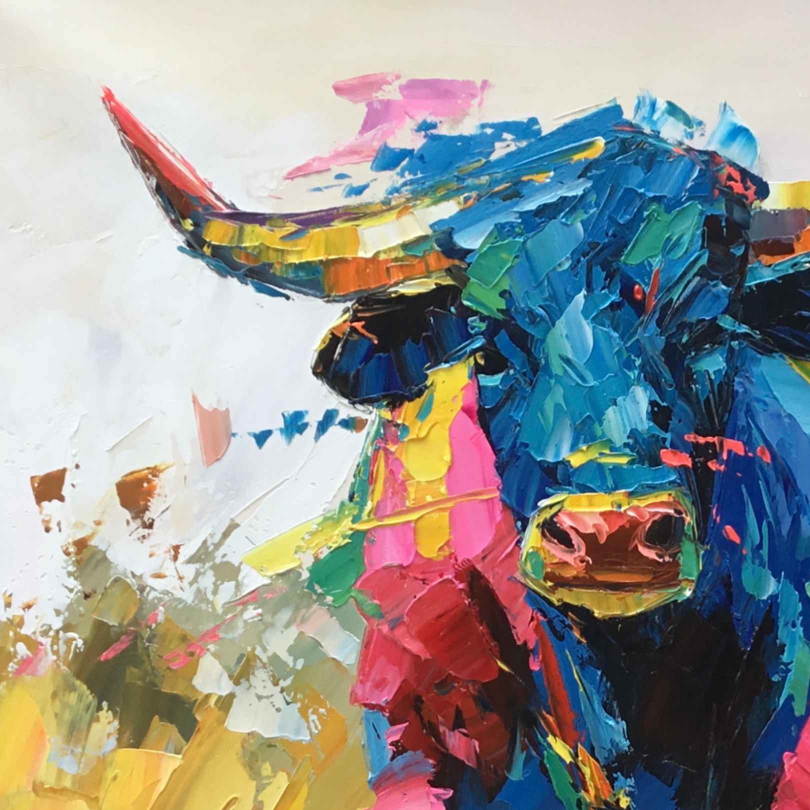 Verleihen Sie Ihrem Zuhause Kraft und Mut mit unserem handgemalten Stiergemälde in Öl! Zeigen Sie Ihren Geist in diesem exklusiven und eleganten Stück. Lassen Sie Ihr Zuhause mit diesem symbolischen Kampfstier Ihren Stil widerspiegeln!