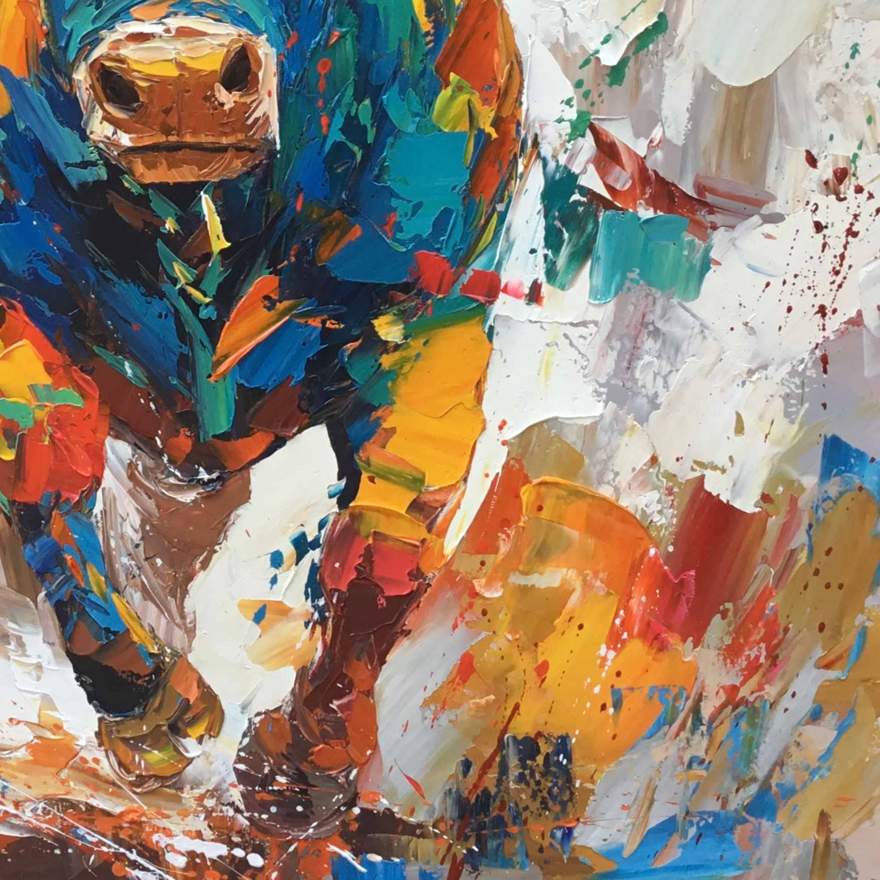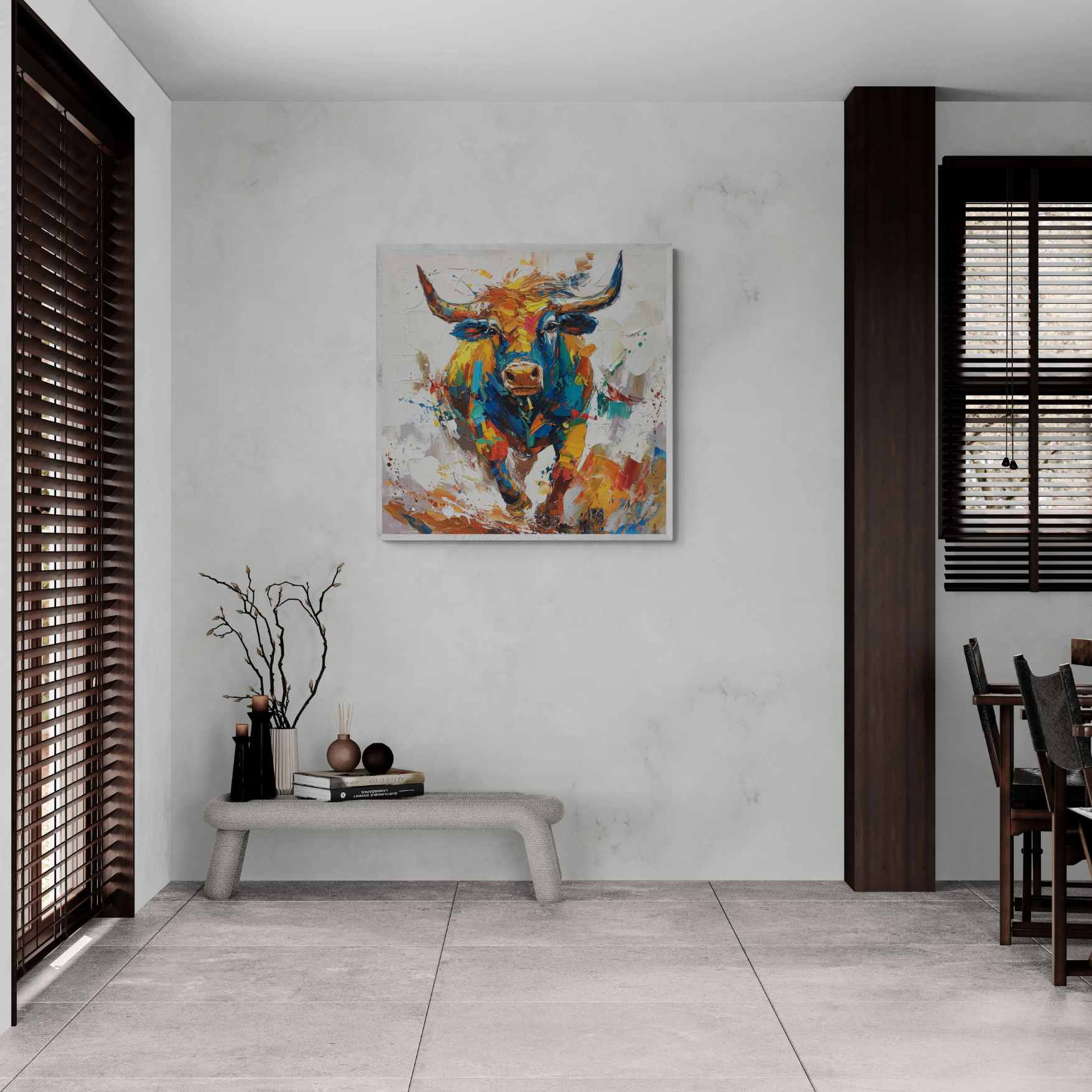 Verleihen Sie Ihrem Zuhause einen Hauch von Stärke und Mut mit unserem handgemalten Stiergemälde in Öl! Dieses originelle und exklusive Stück zeigt den feurigen Blick des Tieres und verleiht Ihrer Inneneinrichtung auf moderne und einzigartige Weise Eleganz und Charakter. Lassen Sie Ihr Zuhause mit diesem symbolischen Kampfstier Ihren Stil widerspiegeln!