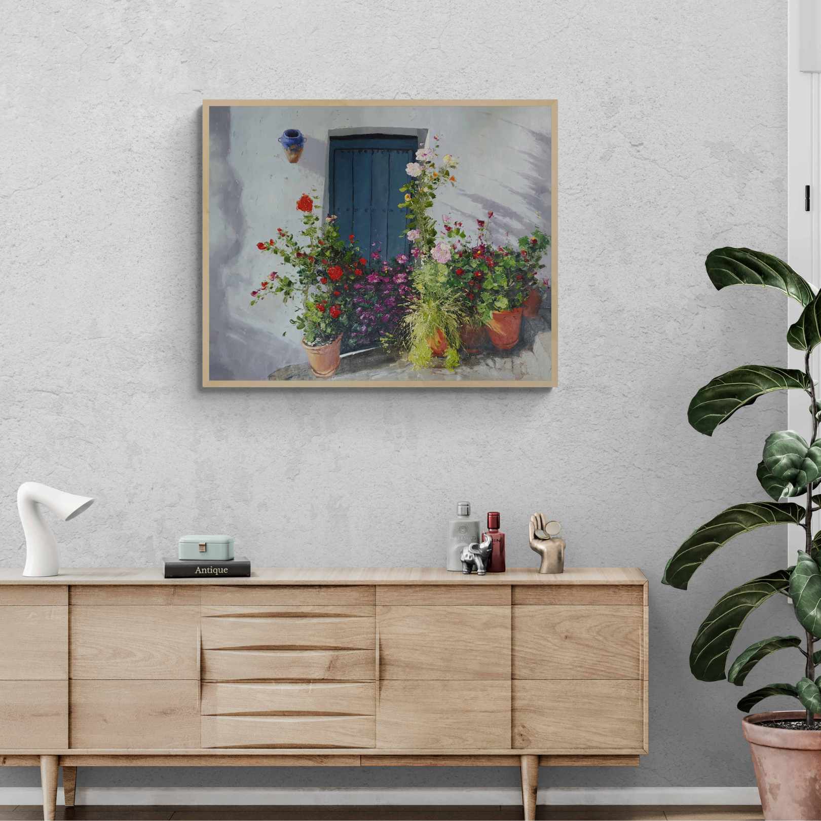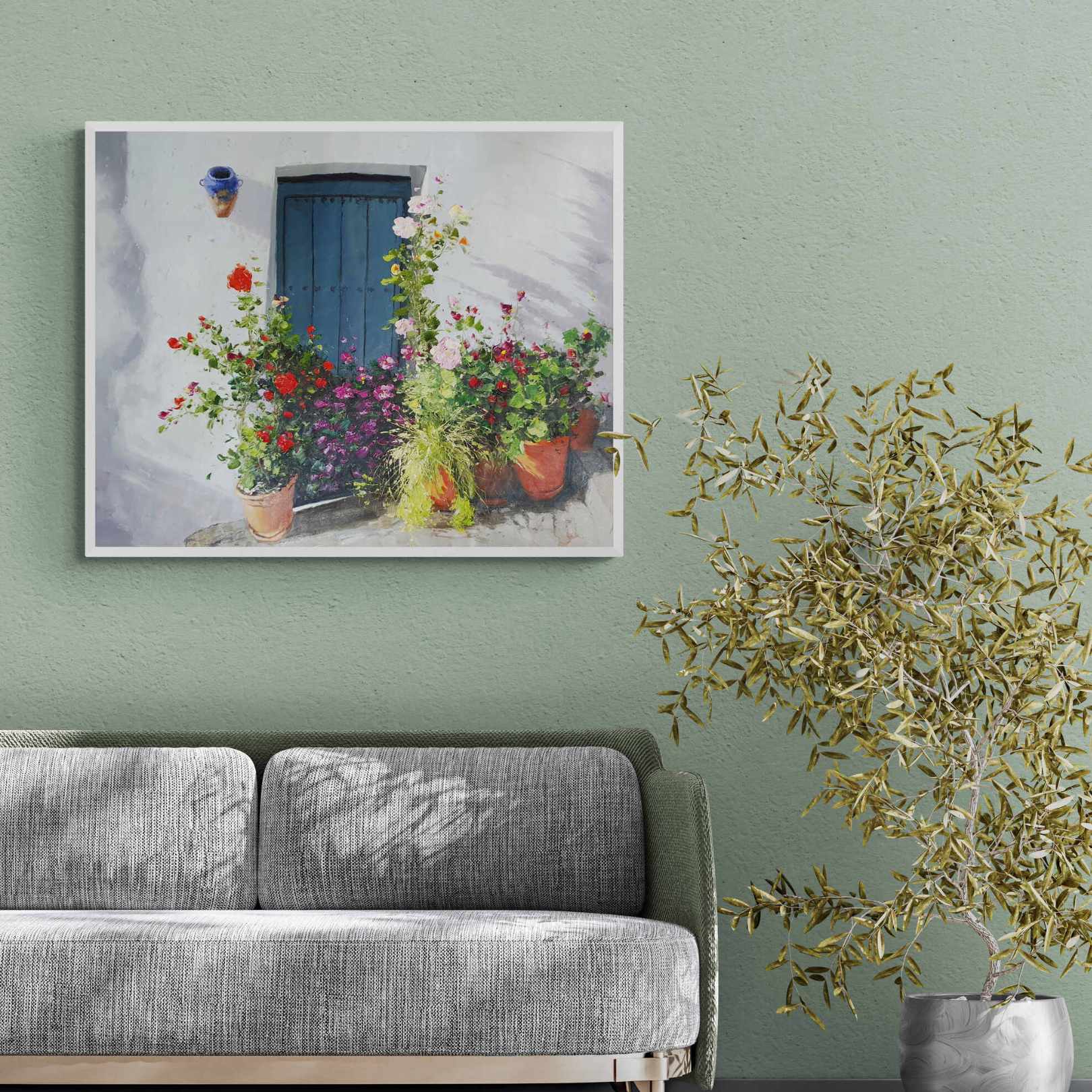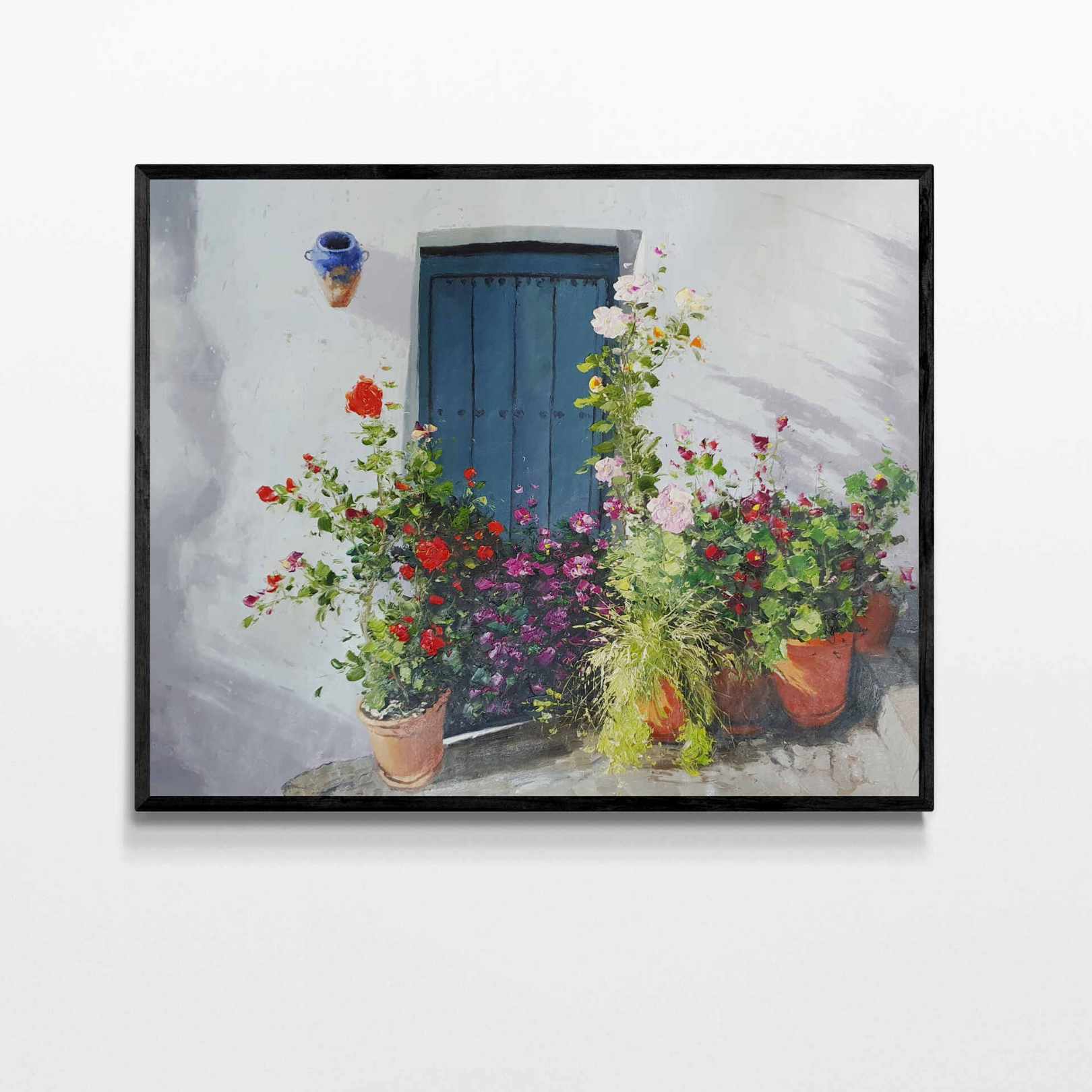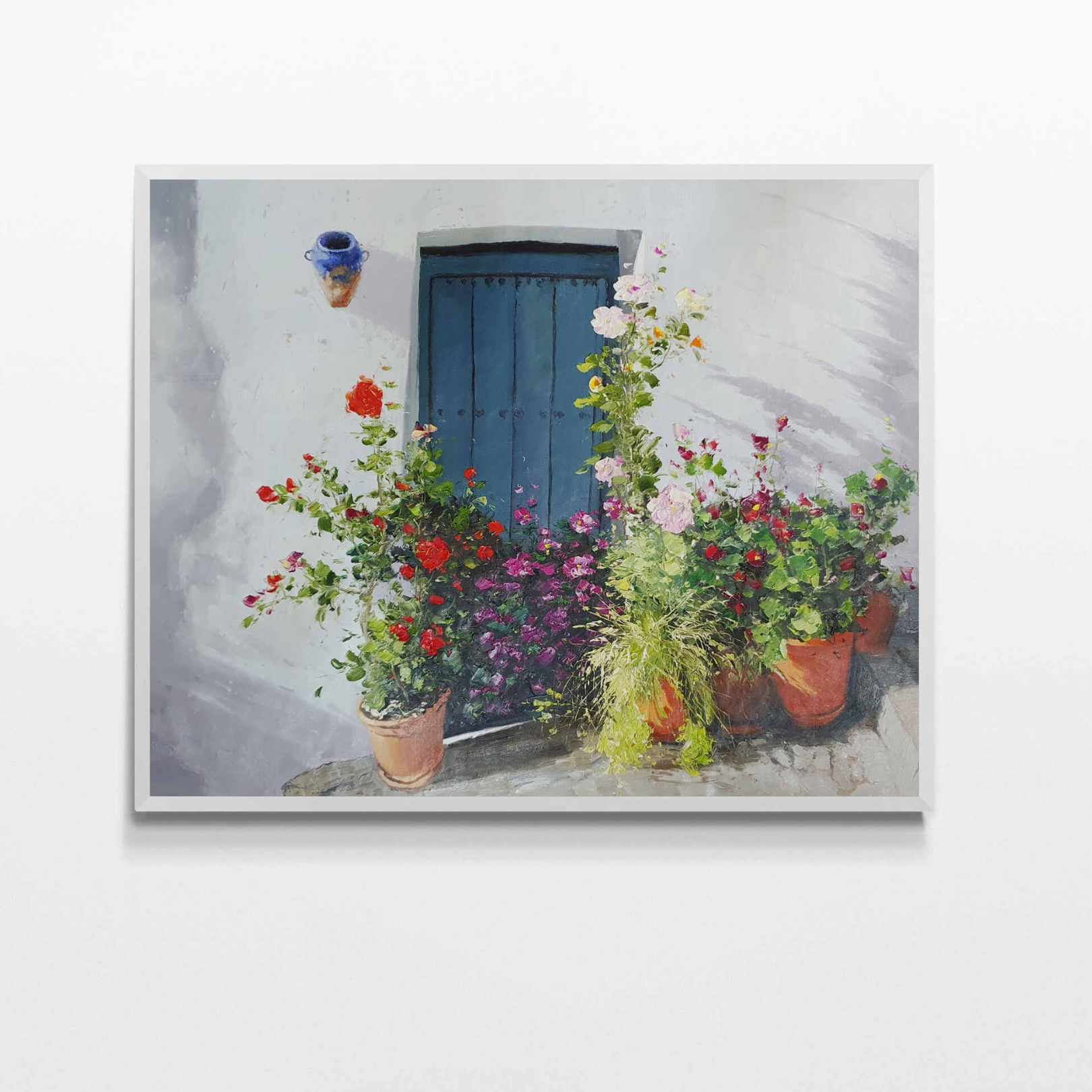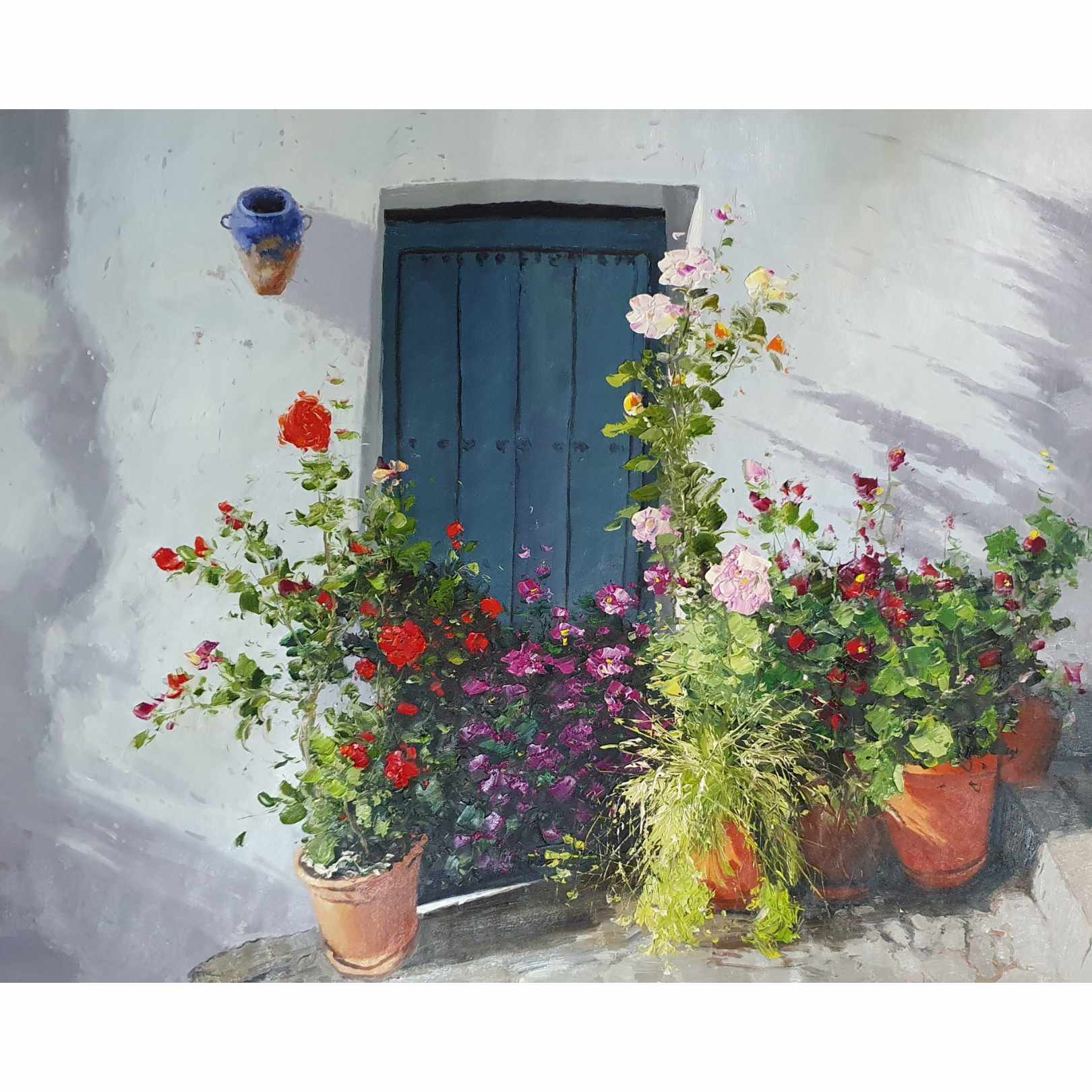 Dieses Ölgemälde von Martin, dem Portal und seinen Blumen ist ein einzigartiges Kunstwerk. Es ist in sanften Pastelltönen gehalten und stellt eine blaue Tür dar, die von Blumen umgeben ist. Dieses Gemälde ist eine ideale Ergänzung für jedes Zuhause oder Büro.