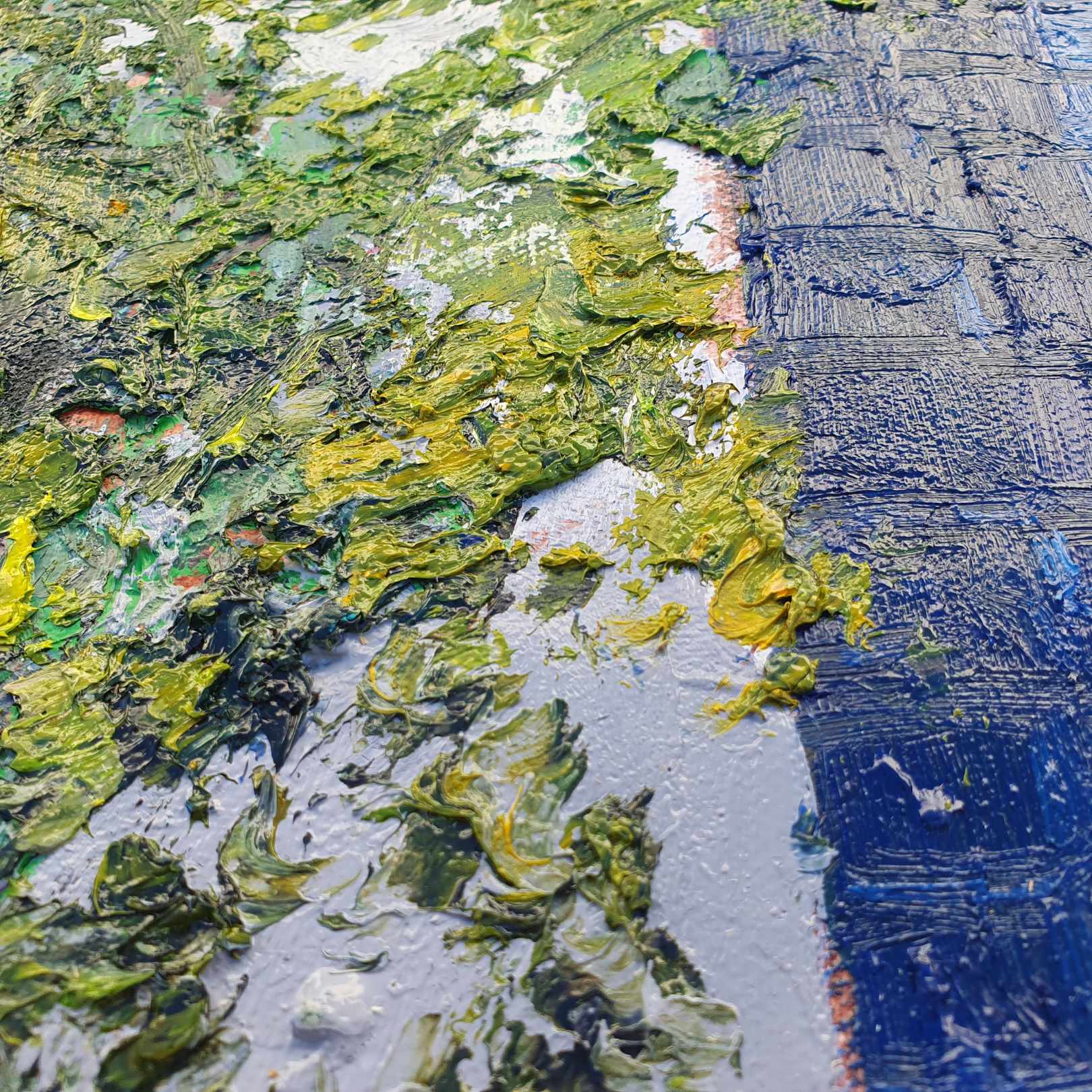 - Spürbare und sichtbare Textur durch die aufgetragenen Farbschichten.