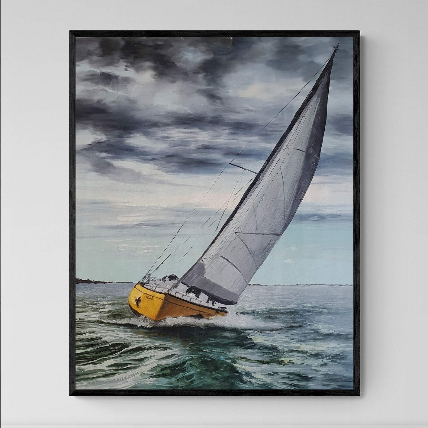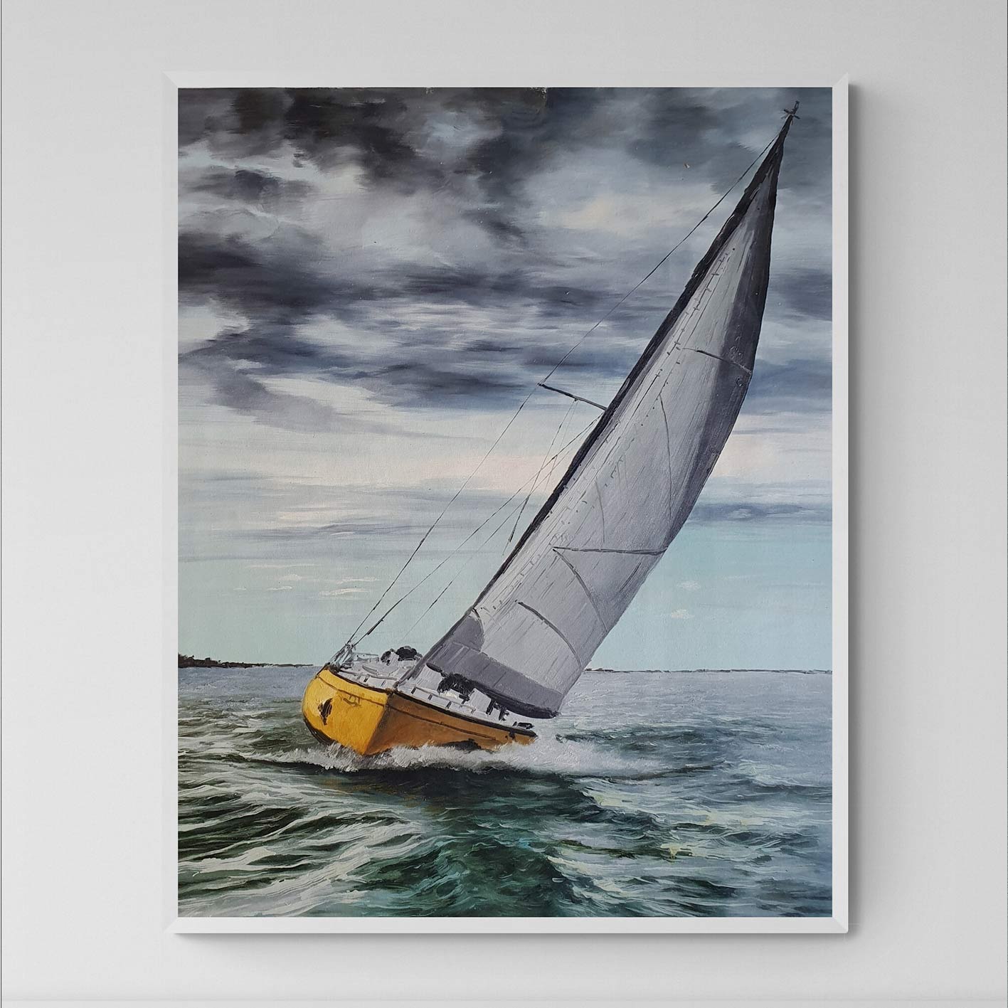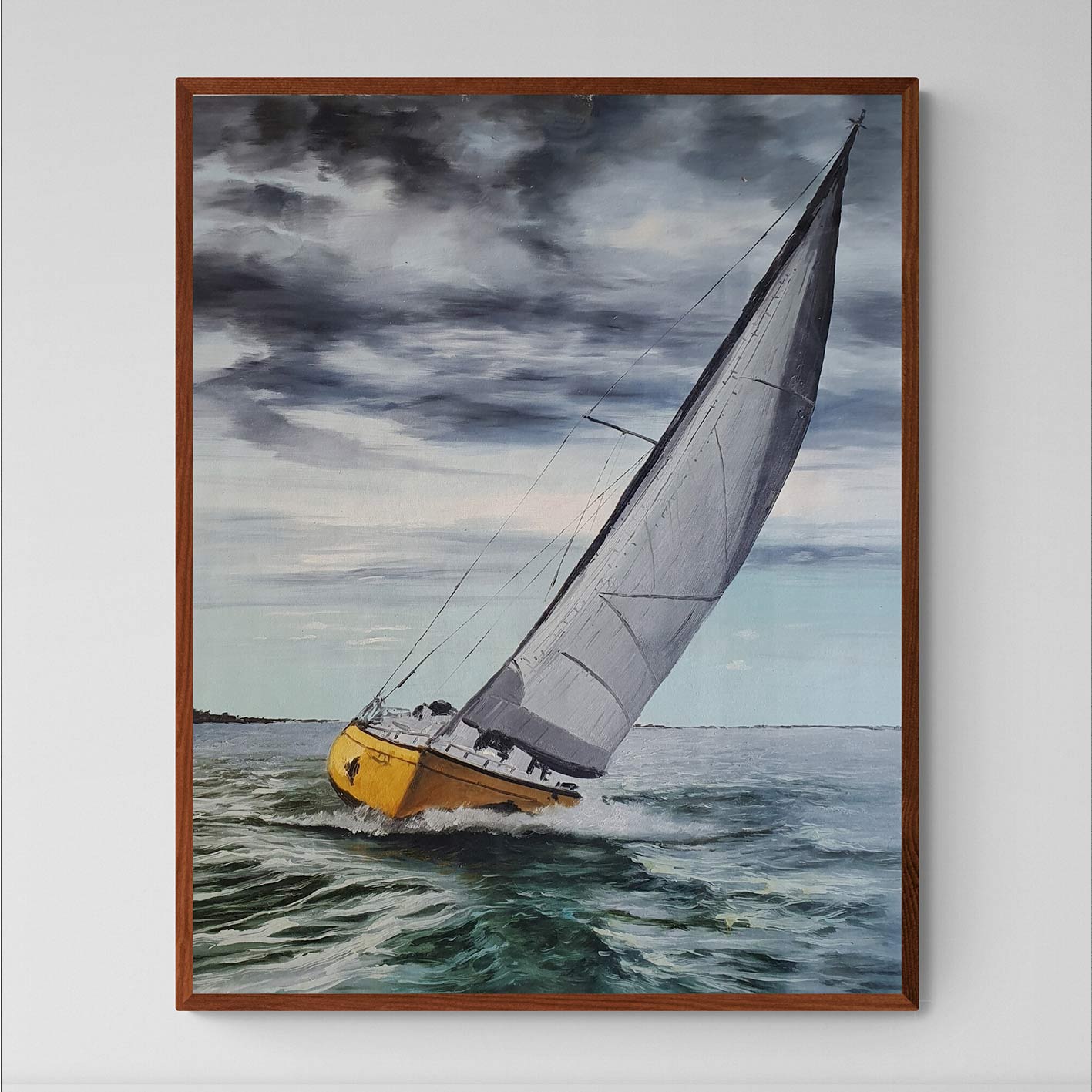 „Gemälde „Ich habe ein gelbes Boot““ ist ein Original-Ölgemälde des Künstlers Martin. Dieses einzigartige Gemälde hebt eine leuchtend gelbe Farbe auf einem Segelboot hervor. Dieses Gemälde ist eine schöne Möglichkeit, jeden Raum zu beleben.
