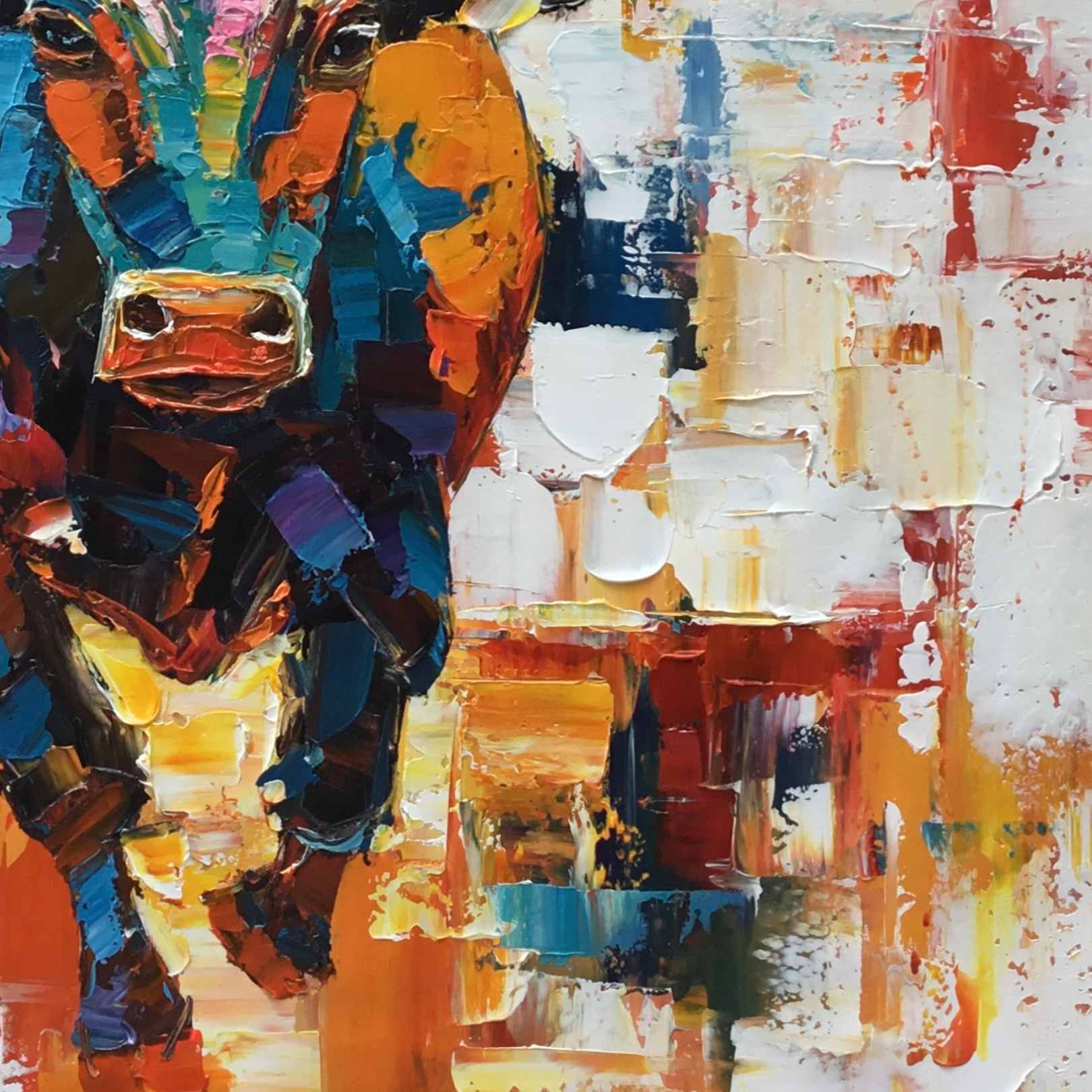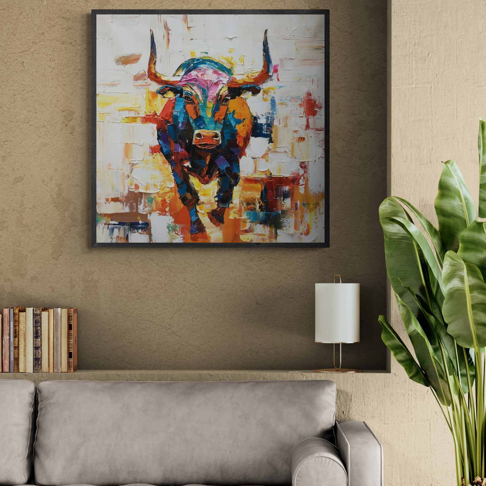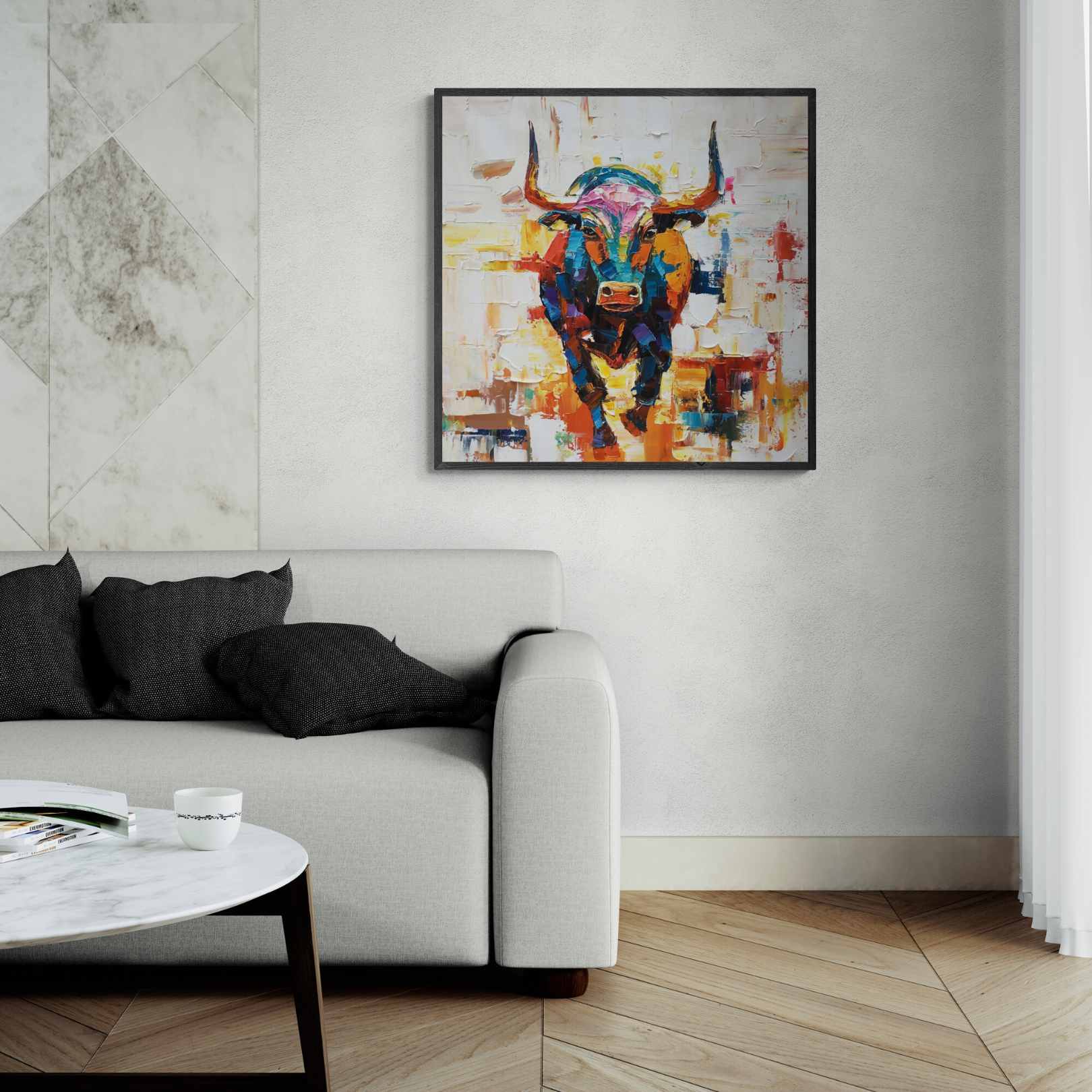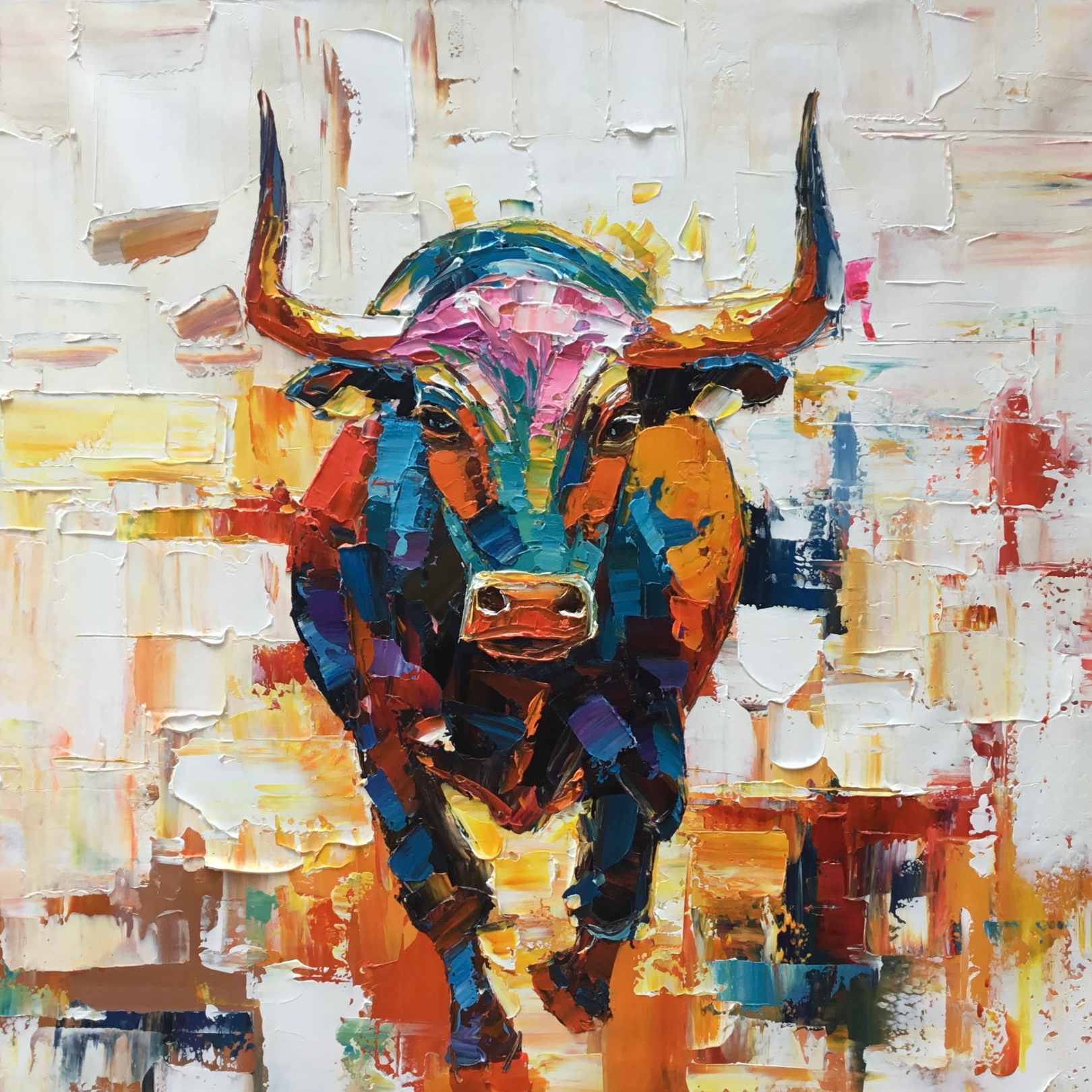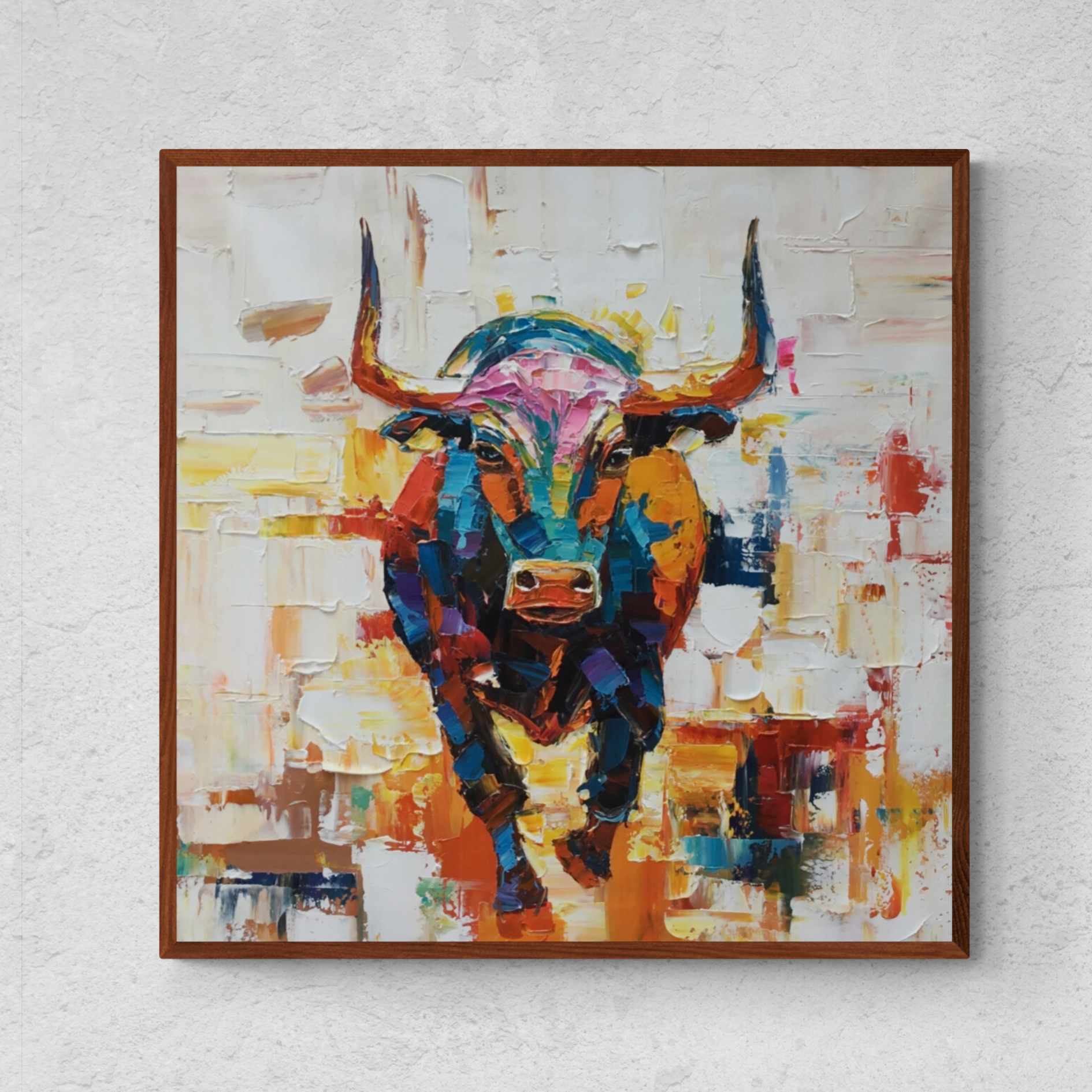 Dieses Bullengemälde demonstriert den Mut und die Demut des Tieres, modern und einzigartig, handgemalt mit Öl für ein originelles und exklusives Stück. Der tapfere Stier symbolisiert Stärke und Mut und ist eine hervorragende Ergänzung für Ihre Heimdekoration mit einem Hauch von Eleganz und Charakter.