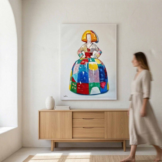 Cuadro Mujer Elegante con Vestido Multicolor – Pintura al Óleo Moderna 82x102 cm