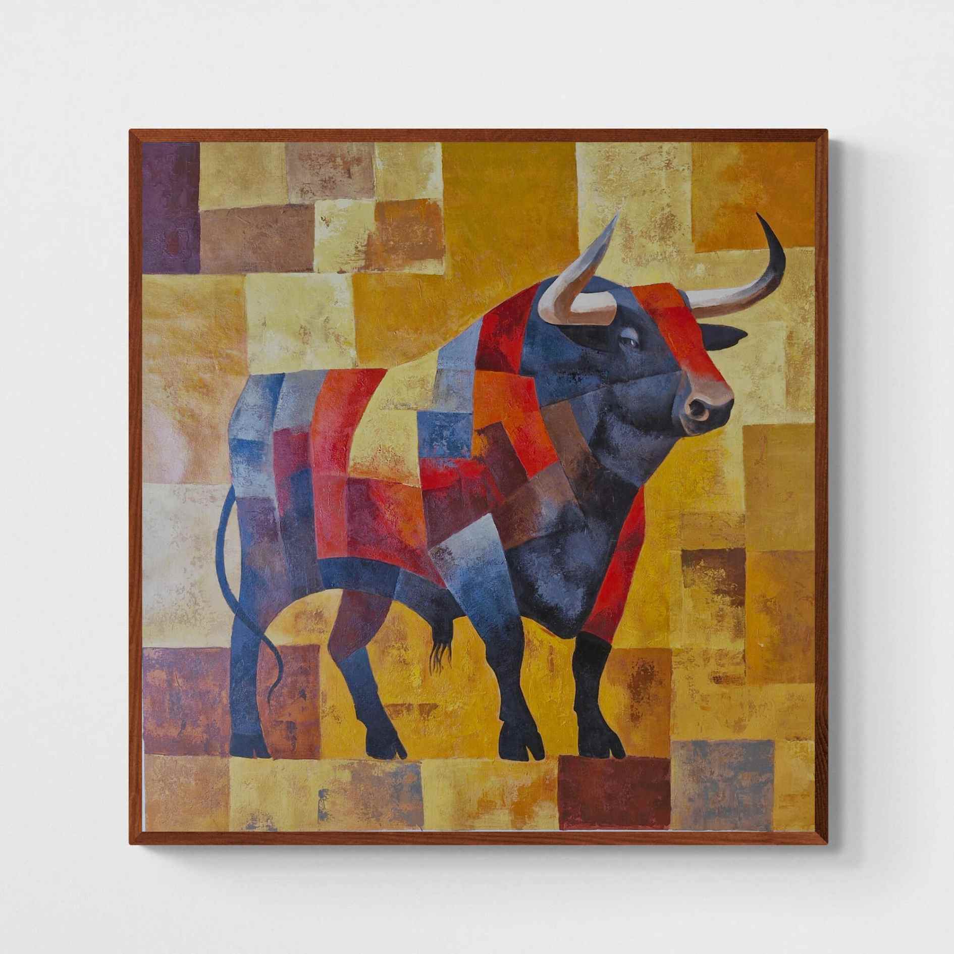 Este cuadro moderno de toro geométrico combina fuerza animal con estética contemporánea. Su diseño a base de bloques cromáticos y formas abstractas en tonos ocres, rojos y azules evoca el arte cubista con un giro actual.